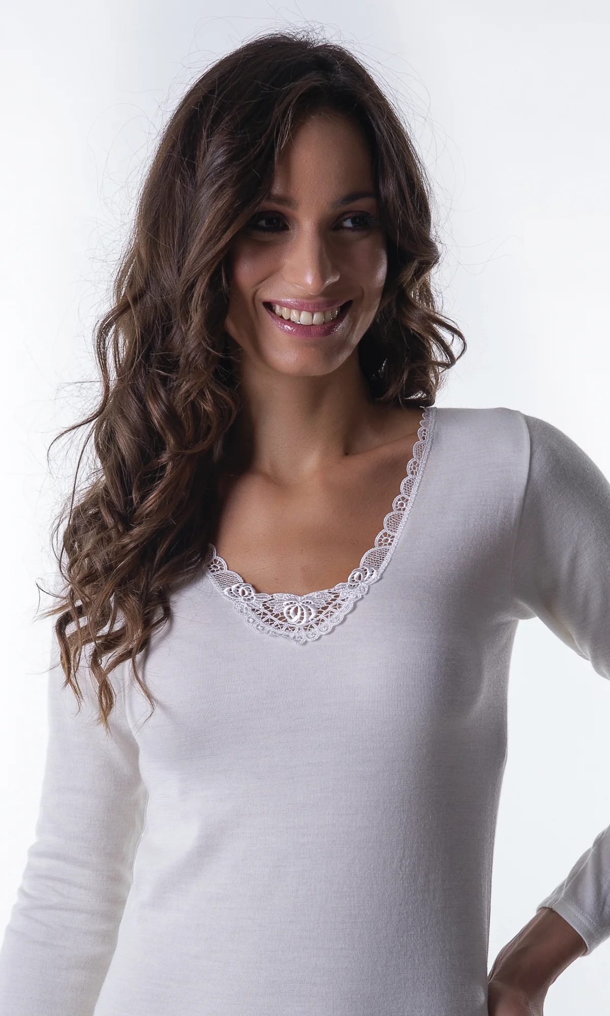 Maglietta manica lunga con pizzo in lana cotone formata al 50% di cotone e 50% di lana. Il cotone rimane aderente alla pelle, mentre la lana rimane all’esterno. Pesante e adatta alle stagioni autunnali e invernali si adatta perfettamente alle forme del tuo corpo, trasmettendo un senso di leggerezza.