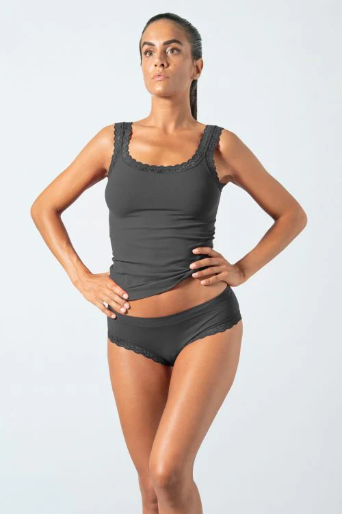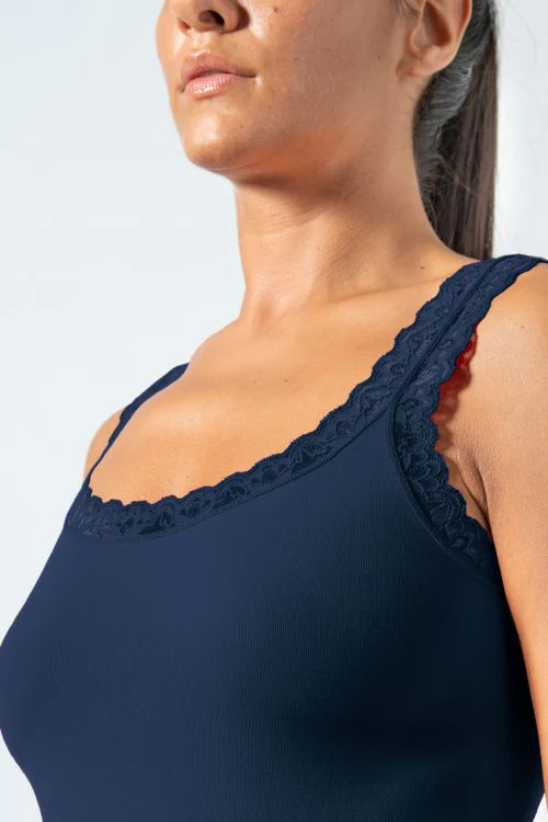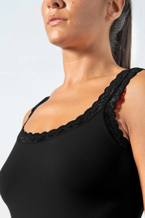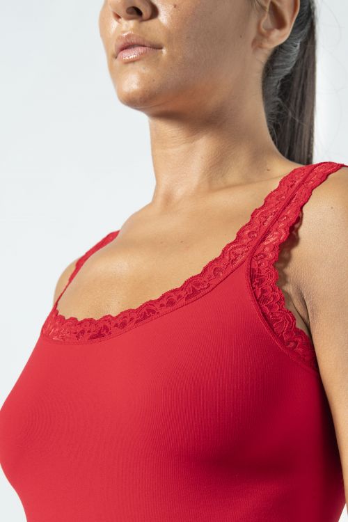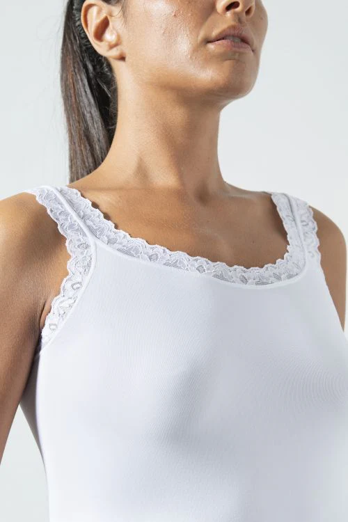 Canotta spallino con pizzo in morbida microfibra, elasticizzata, ottima vestibilitร e comfort assicurato, perfetta per un utilizzo quotidiano. Capo sottoposto a trattamento antibatterico e antiodore resistente ai lavaggi.
