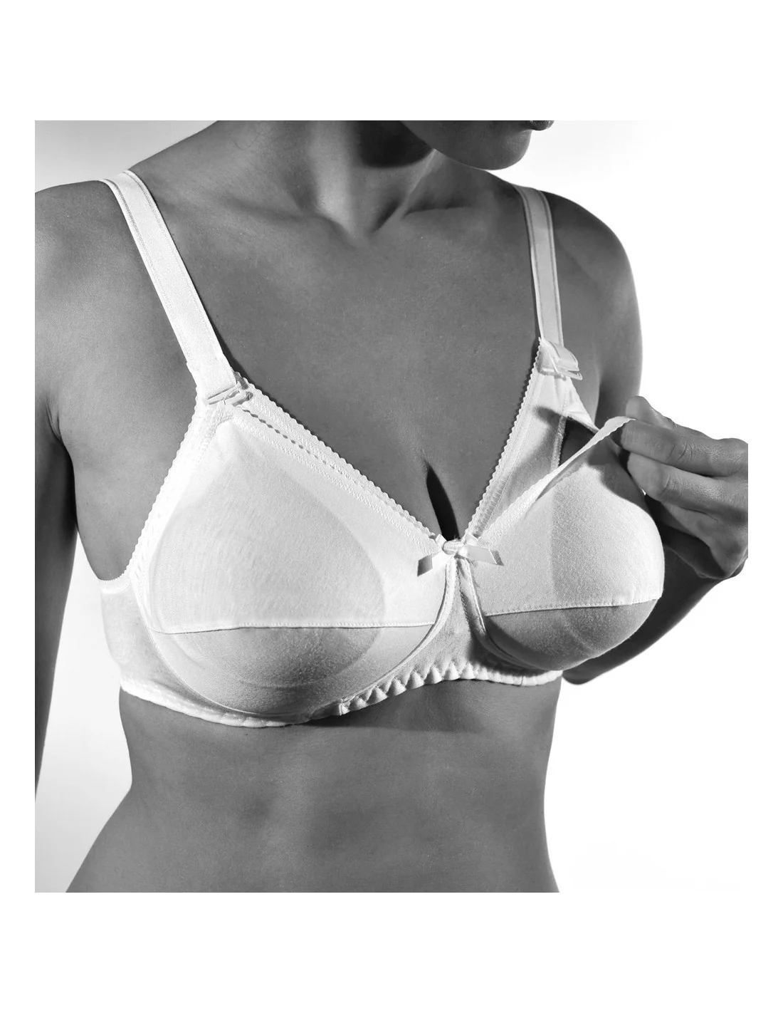 Reggiseno in puro cotone per un contatto naturale. La costruzione interna della coppa sorregge il seno anche durante lโallattamento. Lo sgancio della coppa รจ collocato molto in alto per non graffiare il volto del bimbo.