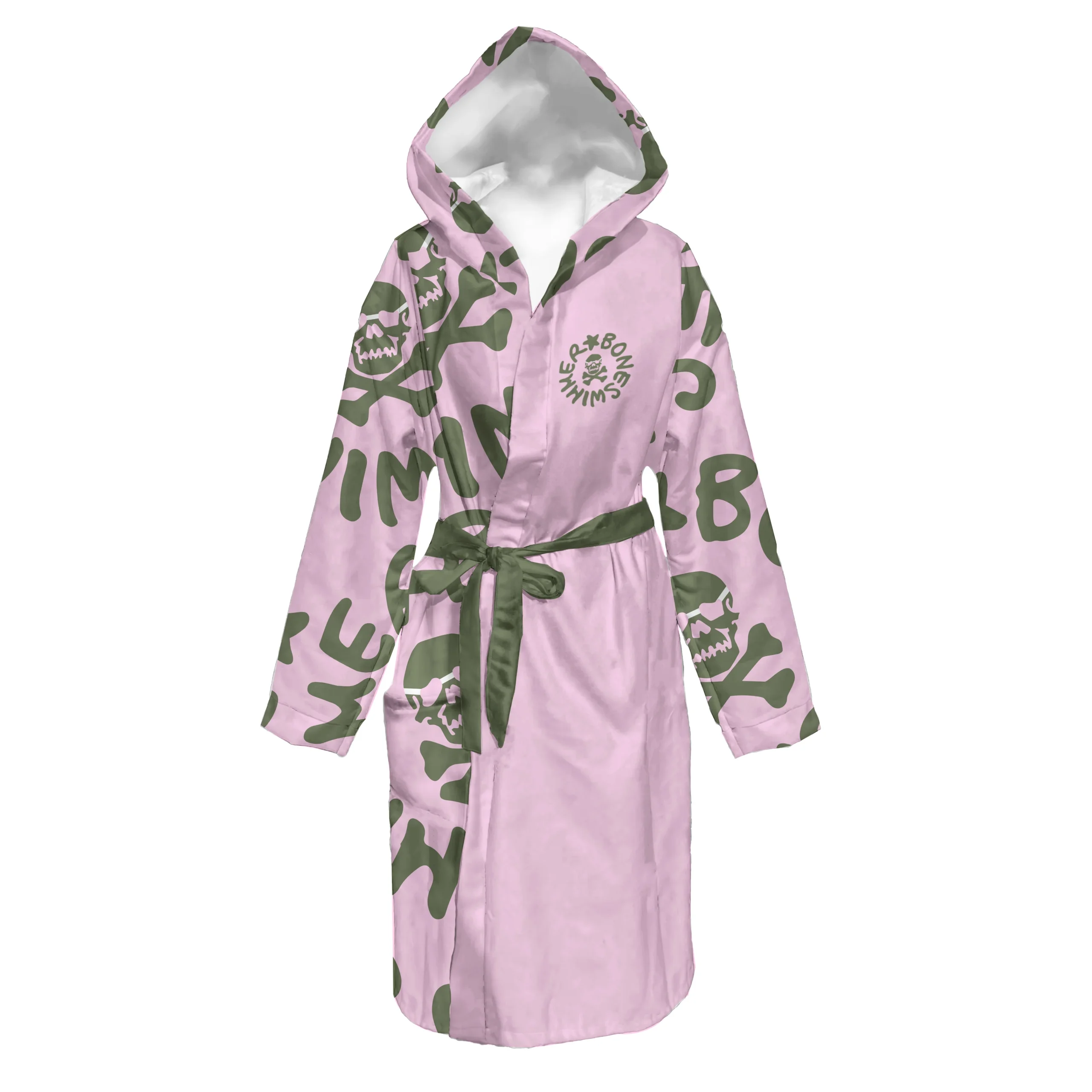 Accappatoio da nuoto in microfibra BONESWIMMER, con logo rosa e verde militare. Morbido, assorbente e ad asciugatura rapida, è l’accessorio indispensabile per il comfort a bordo vasca.