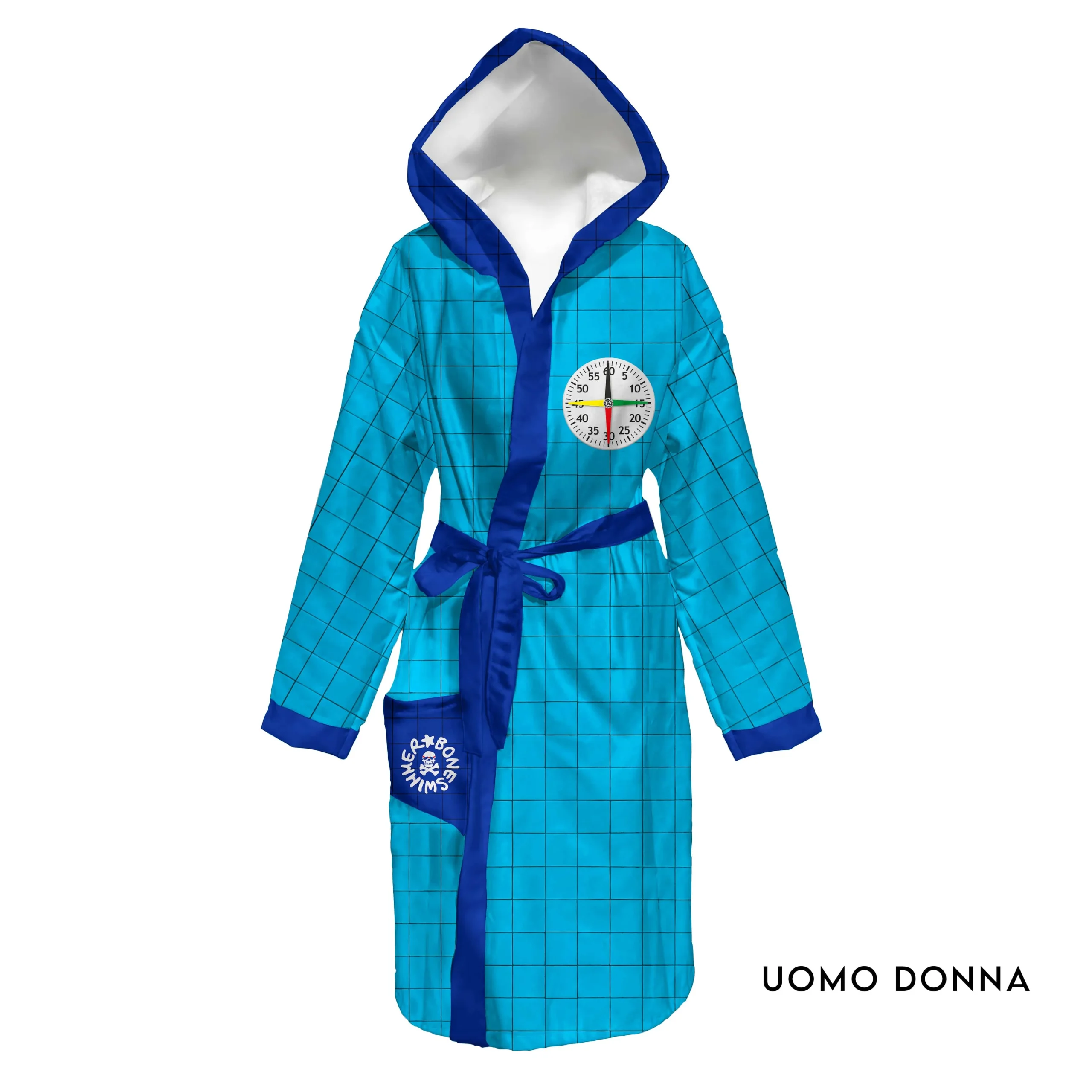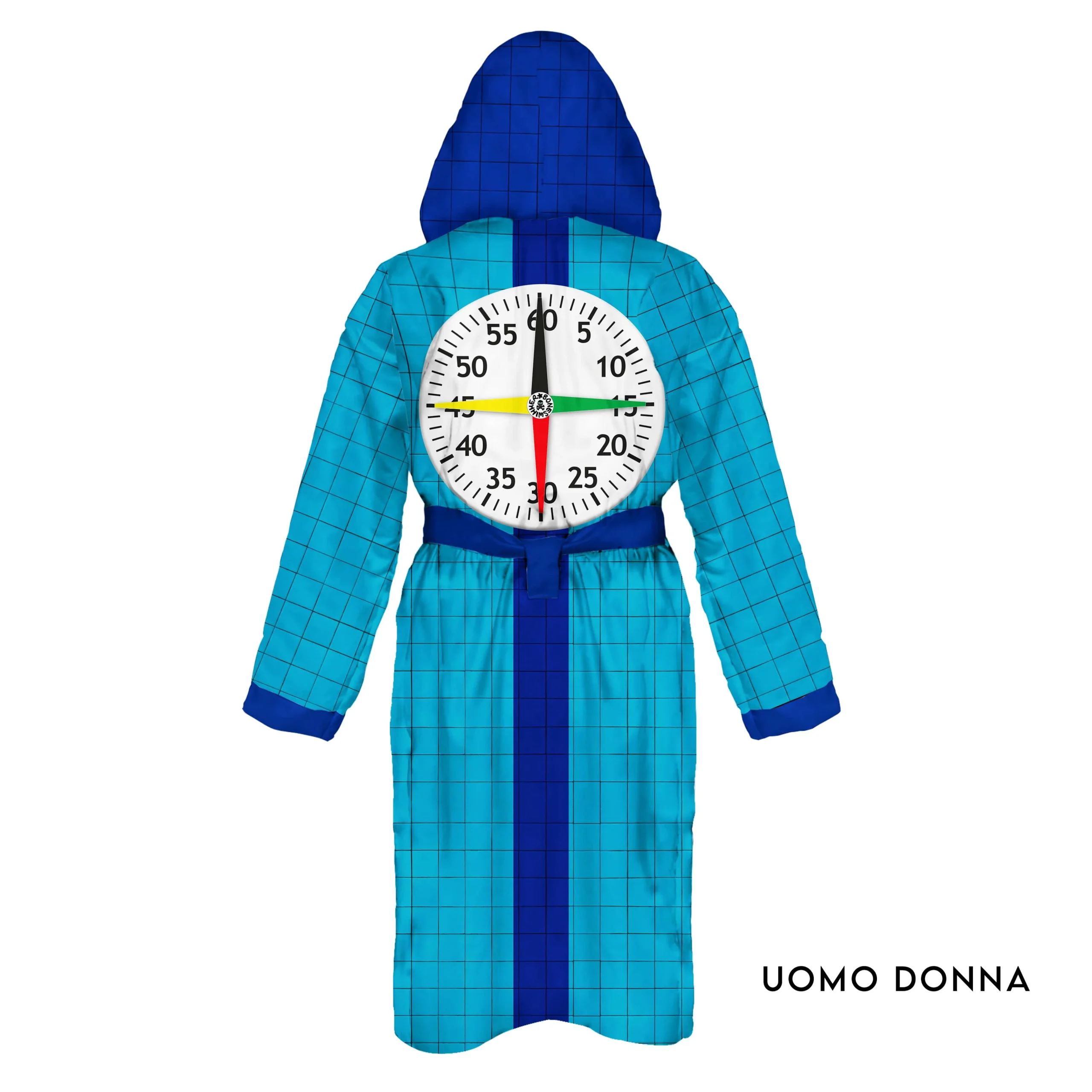 Stampa: mattonelle azzurre come lo sfondo di una piscina e l’immagine di un cronometro per i tempi; un accessorio che non può mancare nella borsa di nuoto per il tuo comfort post allenamento in piscina.