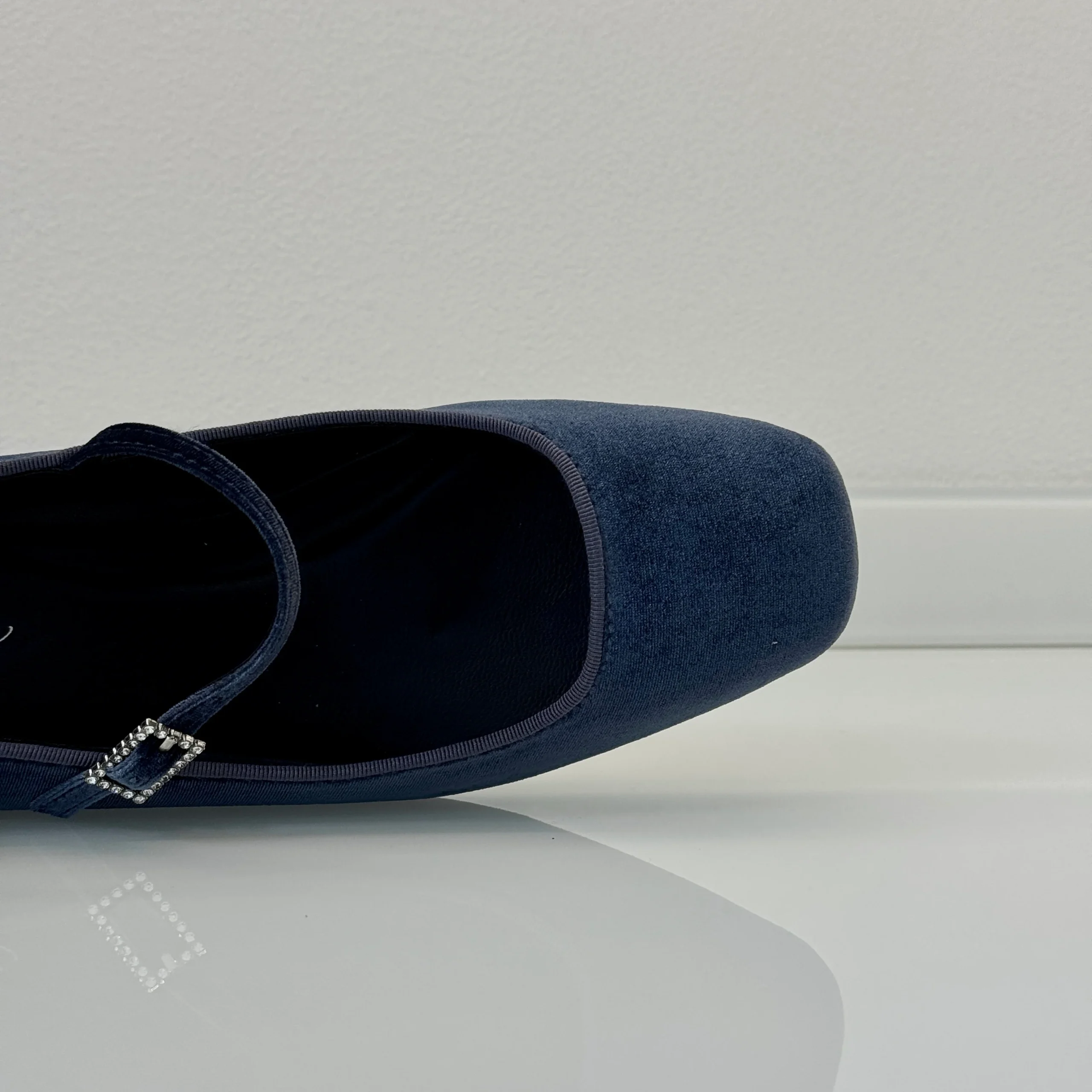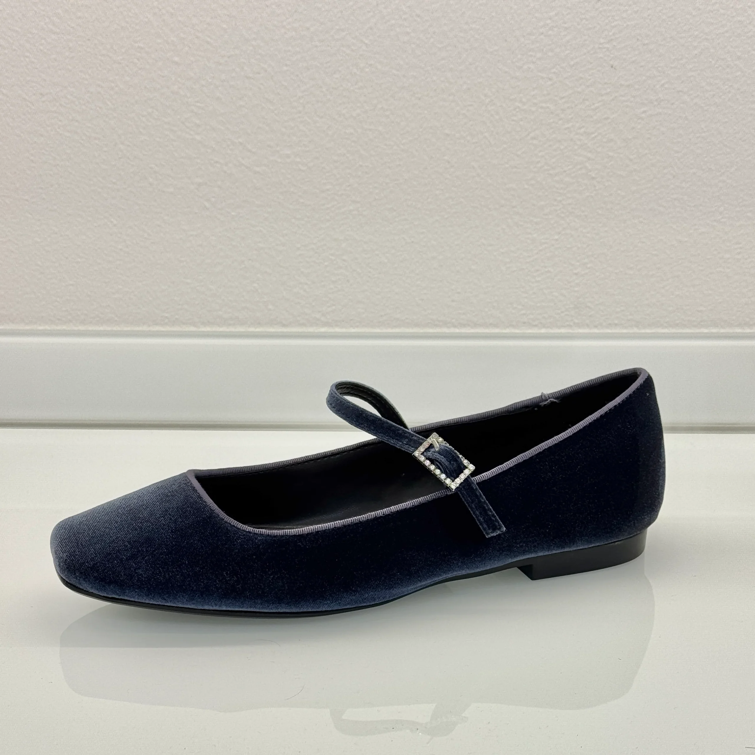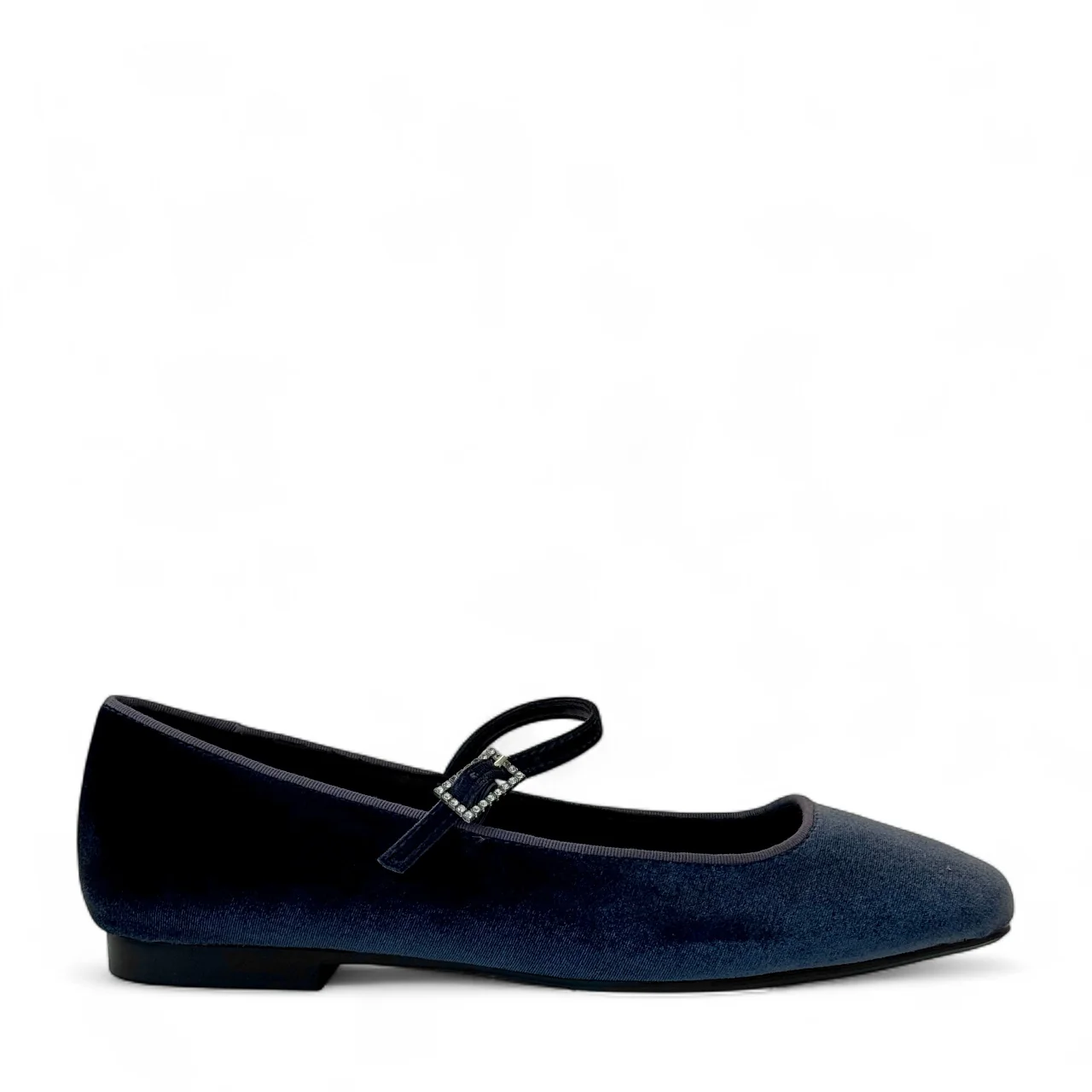 Ballerina Mary Jane in velluto indaco con cinturino, elegante e sofisticata.