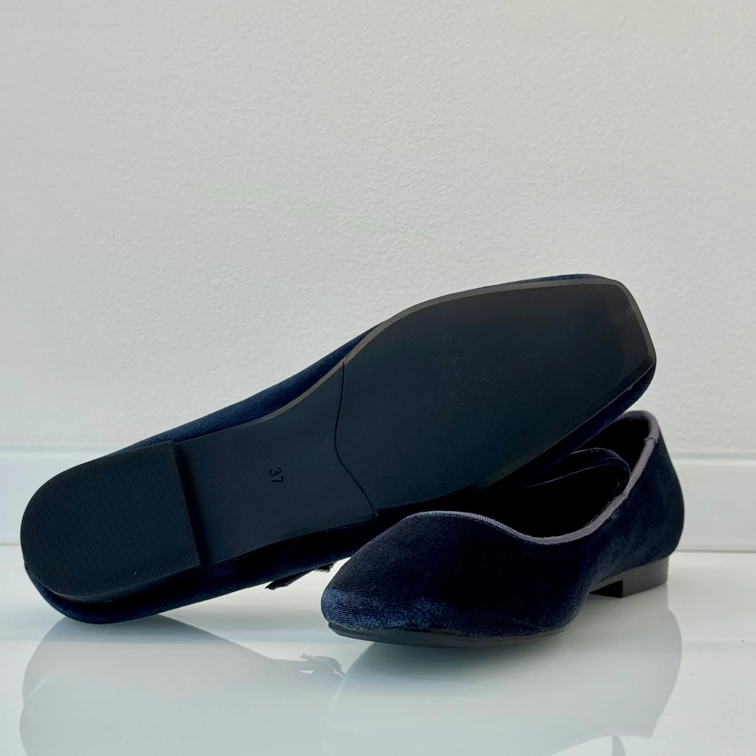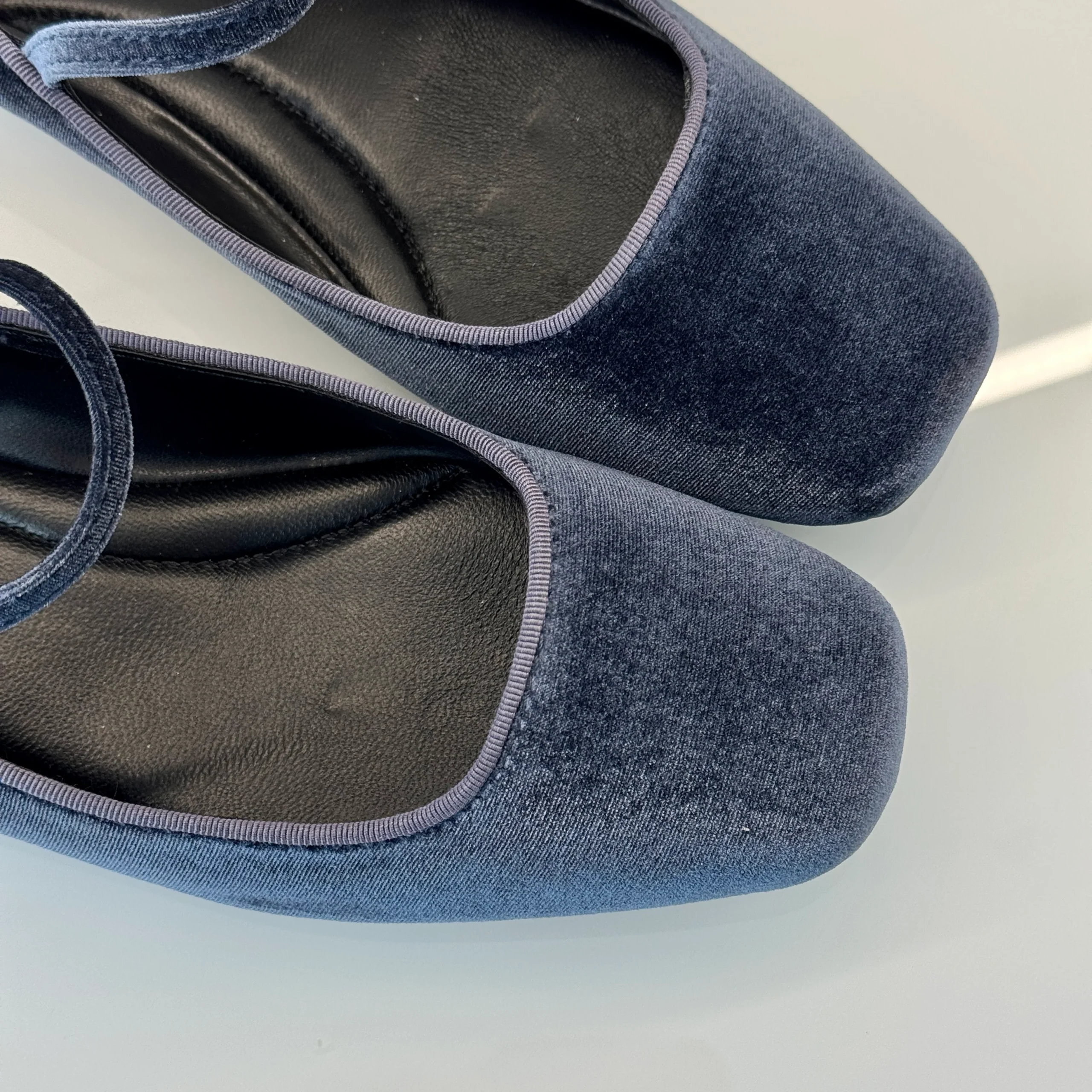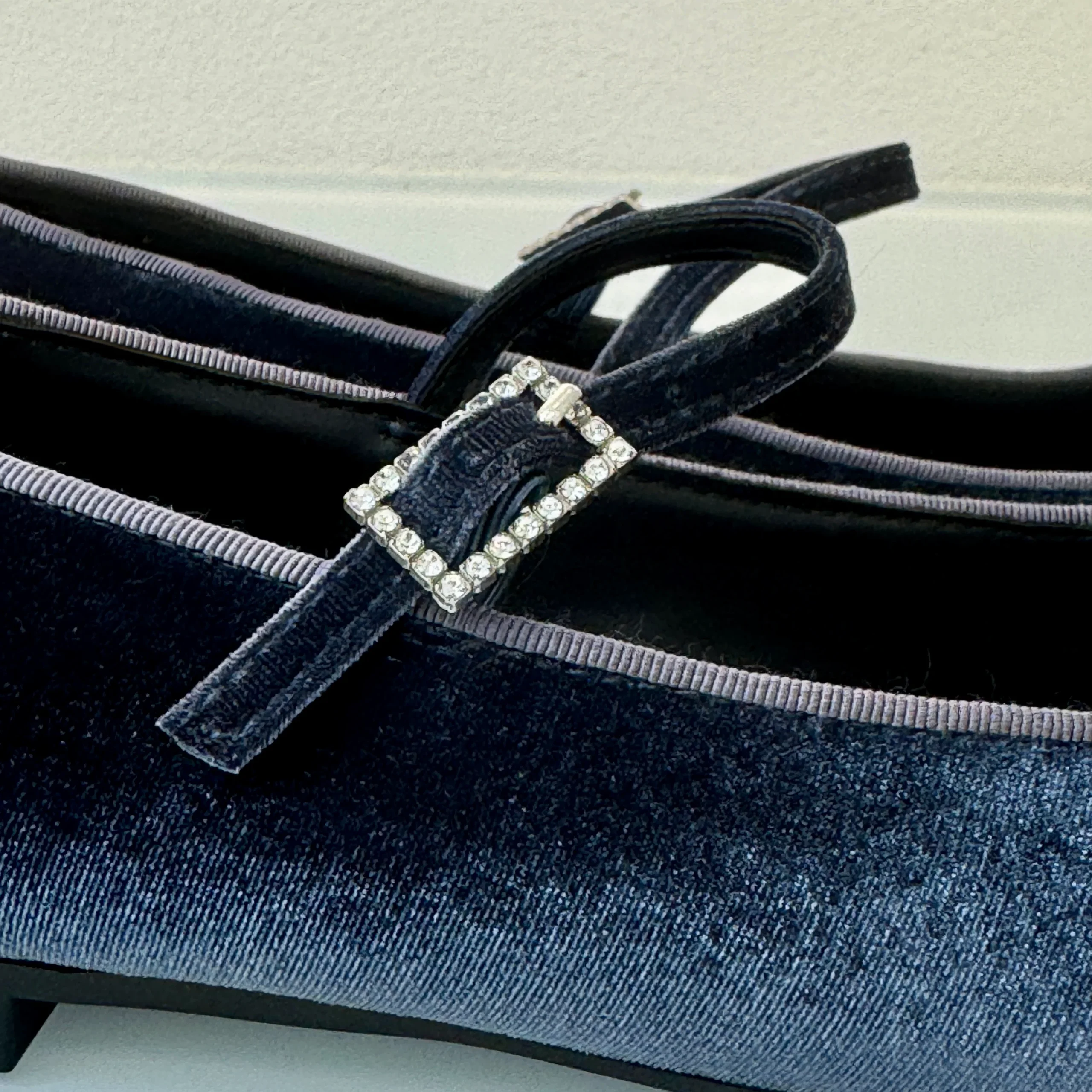 Ballerina Mary Jane in velluto indaco con cinturino, elegante e sofisticata.