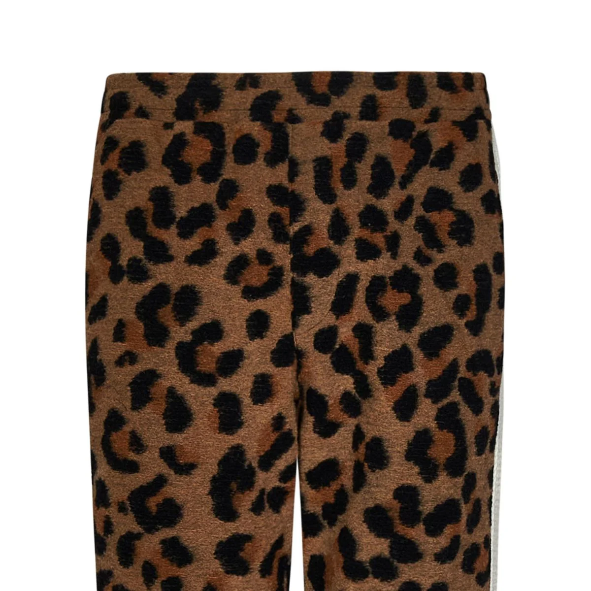 Pantaloni unisex in misto lana marrone leopardato con bande laterali crochet e logo smile.