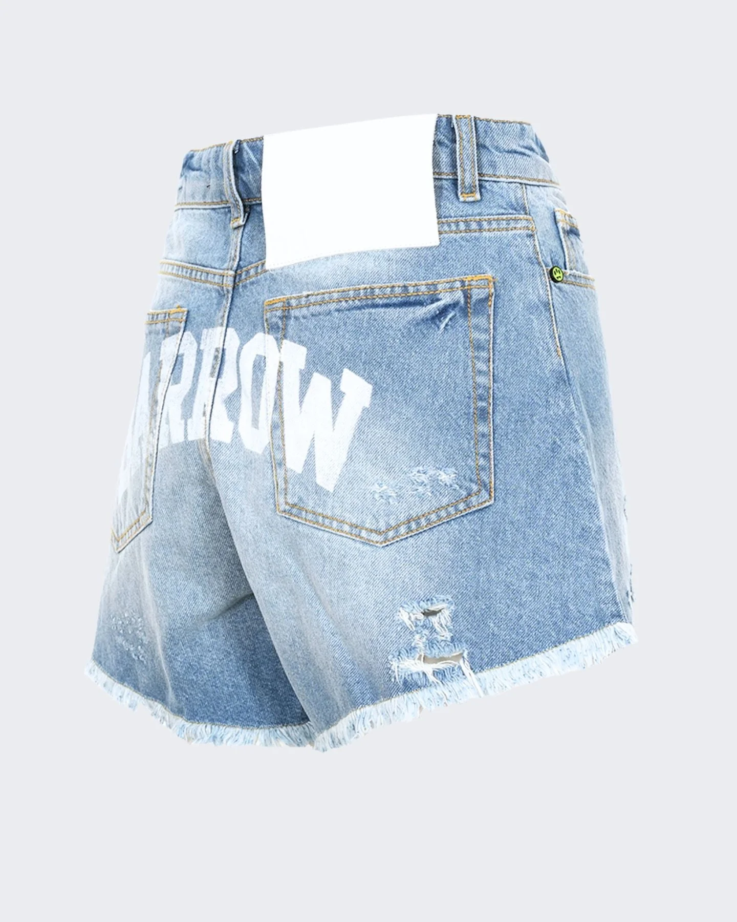 Shorts Barrow realizzato in denim blu medio con abrasioni, rotture, cuciture a contrato, orlo a taglio vivo, patta con zip e bottone smile. Il designe cinque tasche ha il logo sul retro con stampa old vintage.