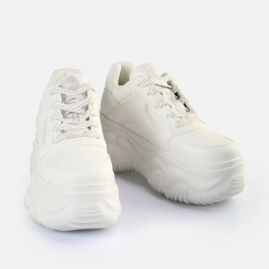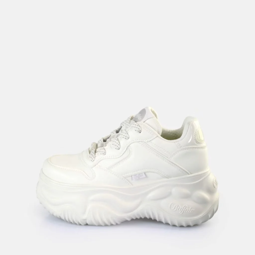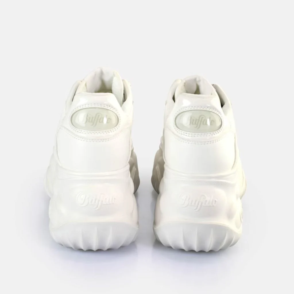 Sneaker vegana in bianco brillanteFintapelle effetto nappa e materiale in mesh traspiranteComodo sottopiede in Memory FoamColore: BiancoAltezza fondo: 7cm