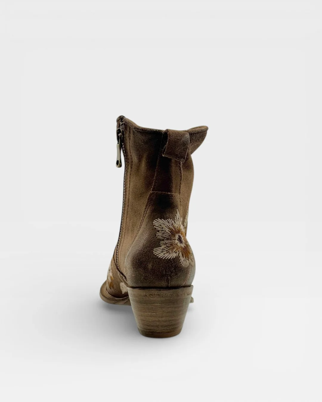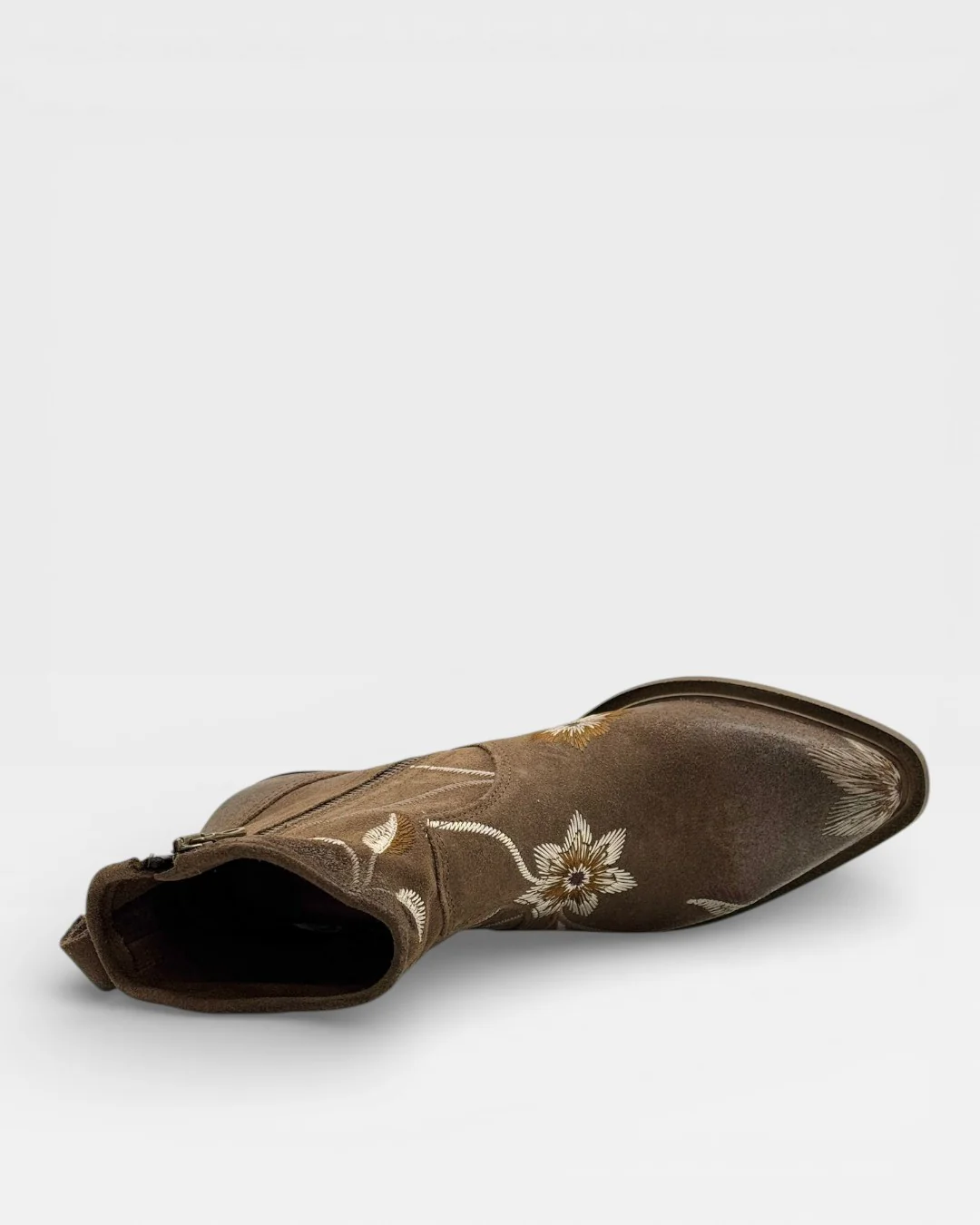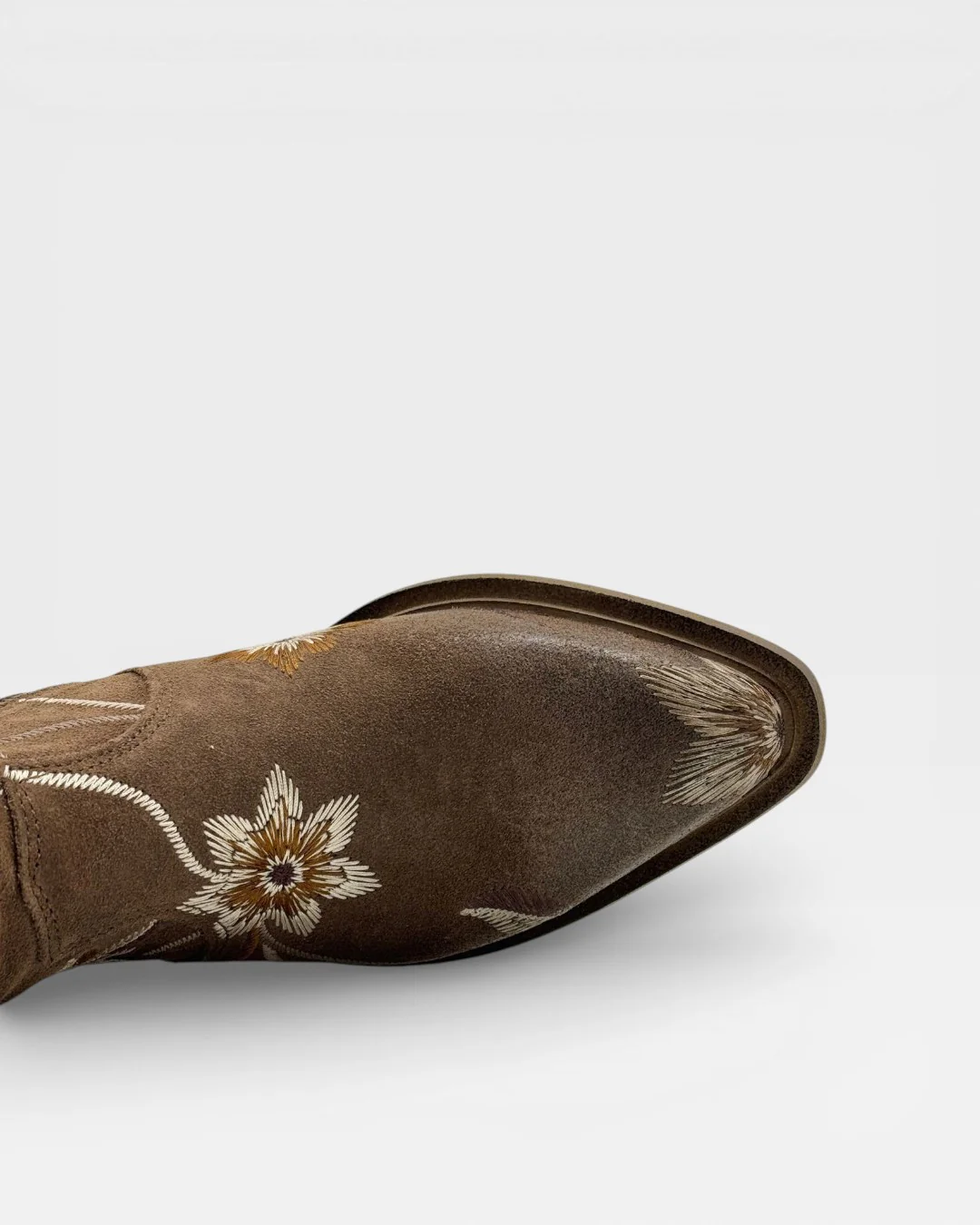 Stivaletto Camperos donna in camoscio moro impreziosito da raffinati ricami floreali tono su tono. Linea femminile, anima western chic e comfort assoluto per ogni giorno.