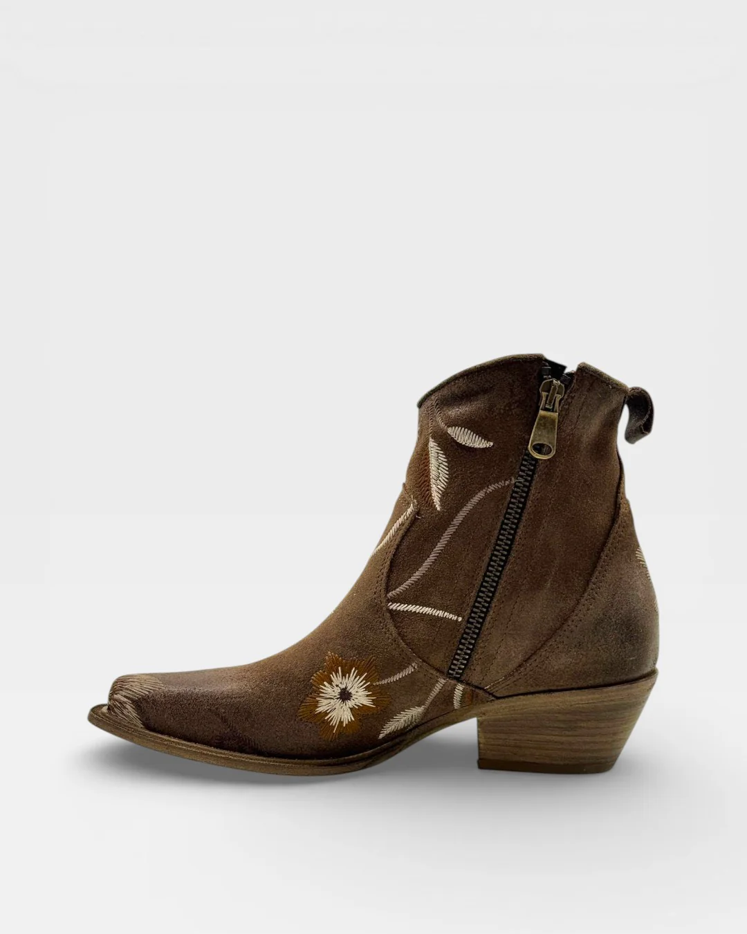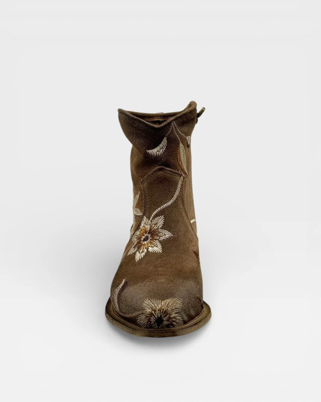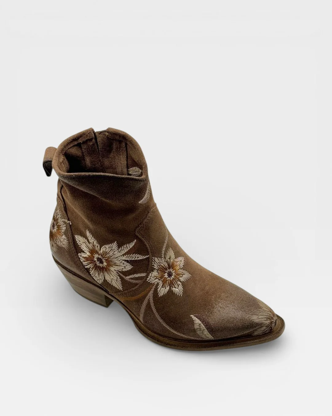 Stivaletto Camperos donna in camoscio moro impreziosito da raffinati ricami floreali tono su tono. Linea femminile, anima western chic e comfort assoluto per ogni giorno.
