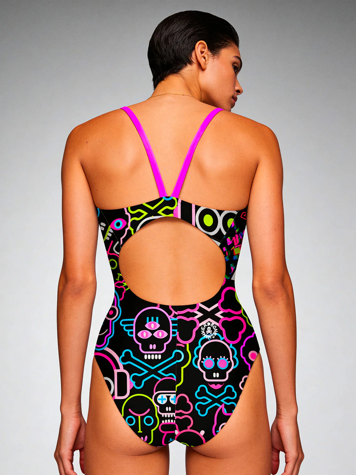 Costume intero da allenamento, modello Ibiza. Stampa “Skull tribe”: pattern tribale, outline teschi neon, colori suggestivi fluo.