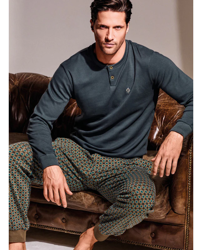 Pigiama in caldo cotone serafino con bottoni e pantalone lungo con polsini.