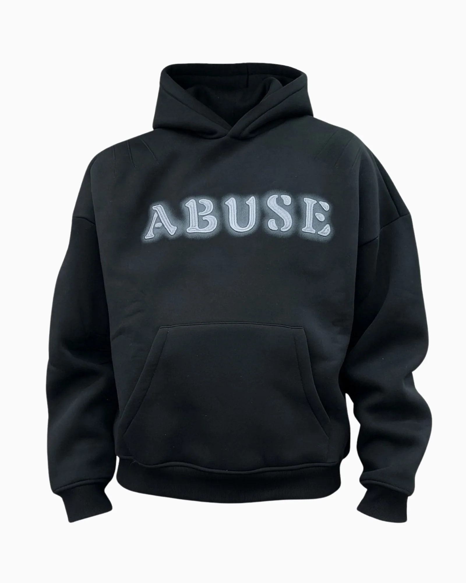 La scritta ABUSE รจ ricamata a rilievo sul petto, con un effetto tridimensionale che dona profonditร e carattere al capo. La tasca a marsupio, il cappuccio avvolgente e i polsini elasticizzati completano un design pensato per chi vive la strada con personalitร e stile.
