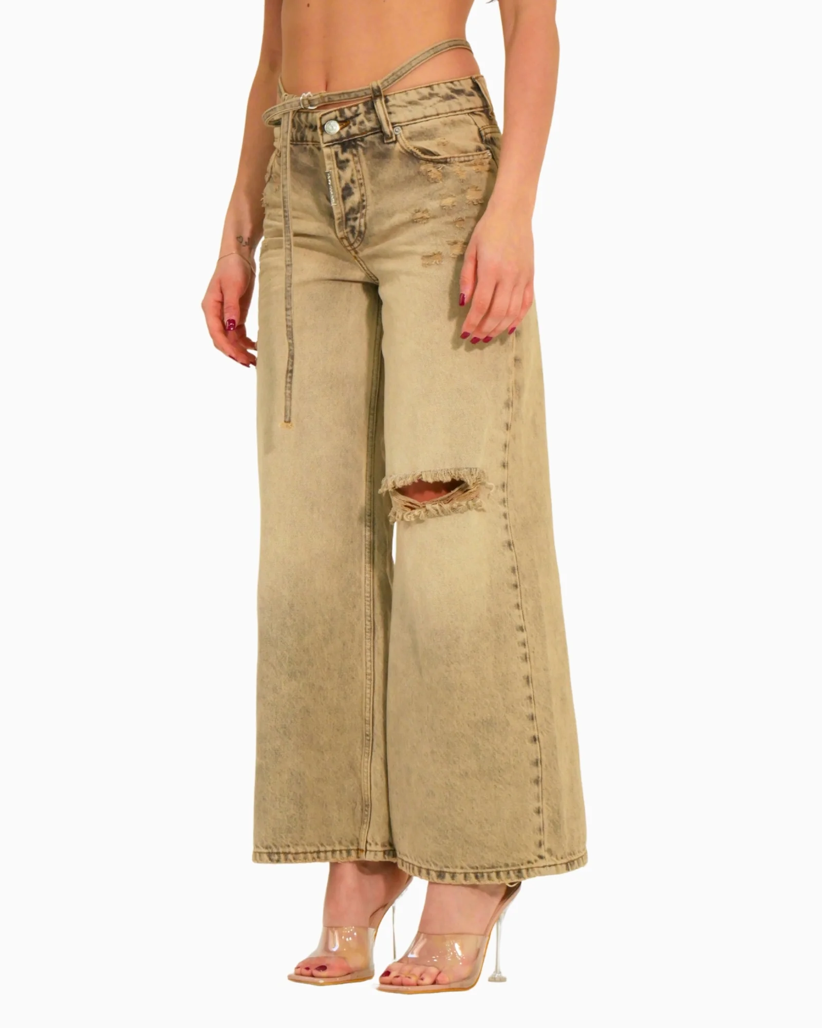 Jeans Donna Gamba Larga con Effetto Used e Lacci in Vita
