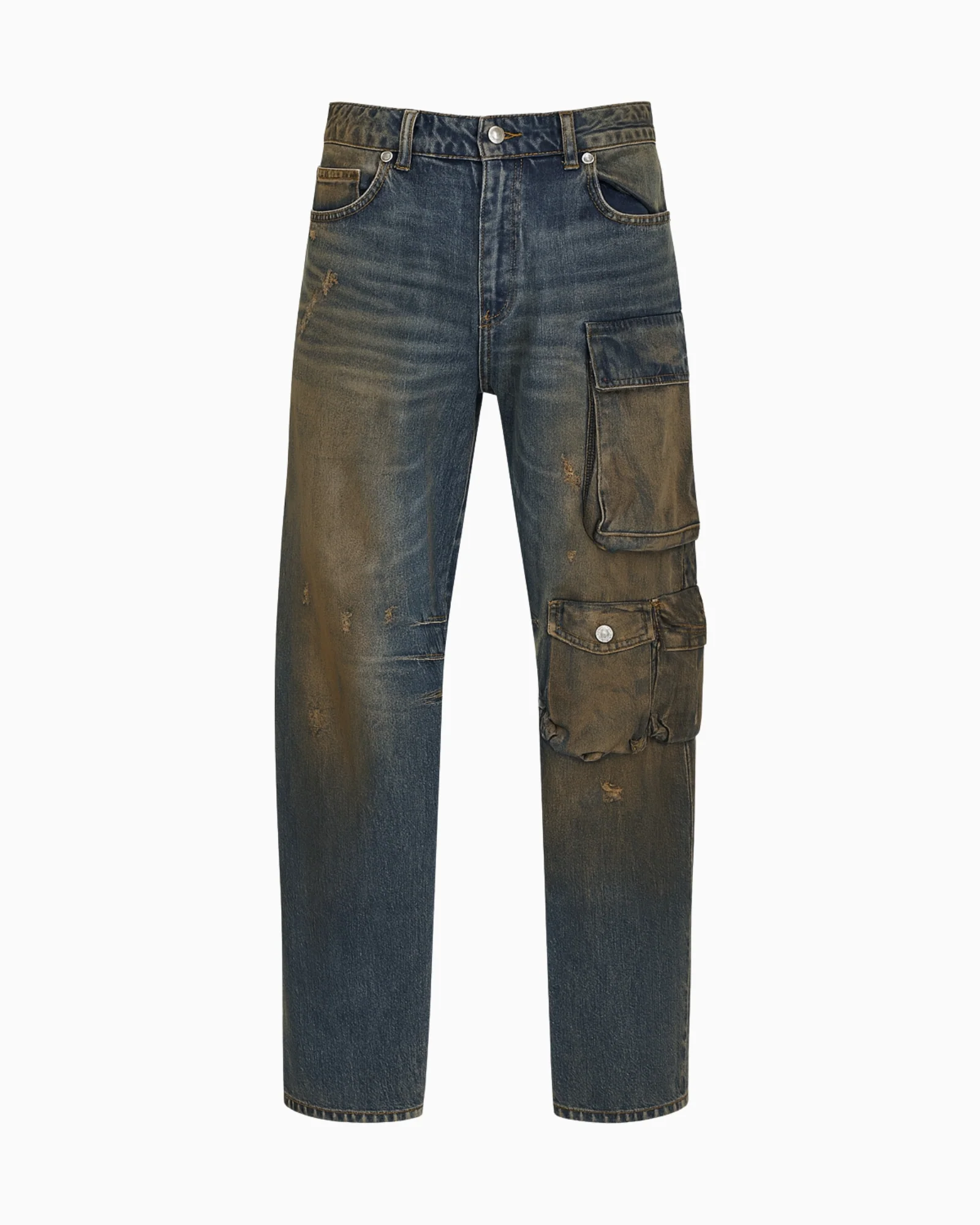 lโeffetto vissuto con sfumature e rovinature naturali, e le tasche cargo applicate che donano un tocco autentico e funzionale.