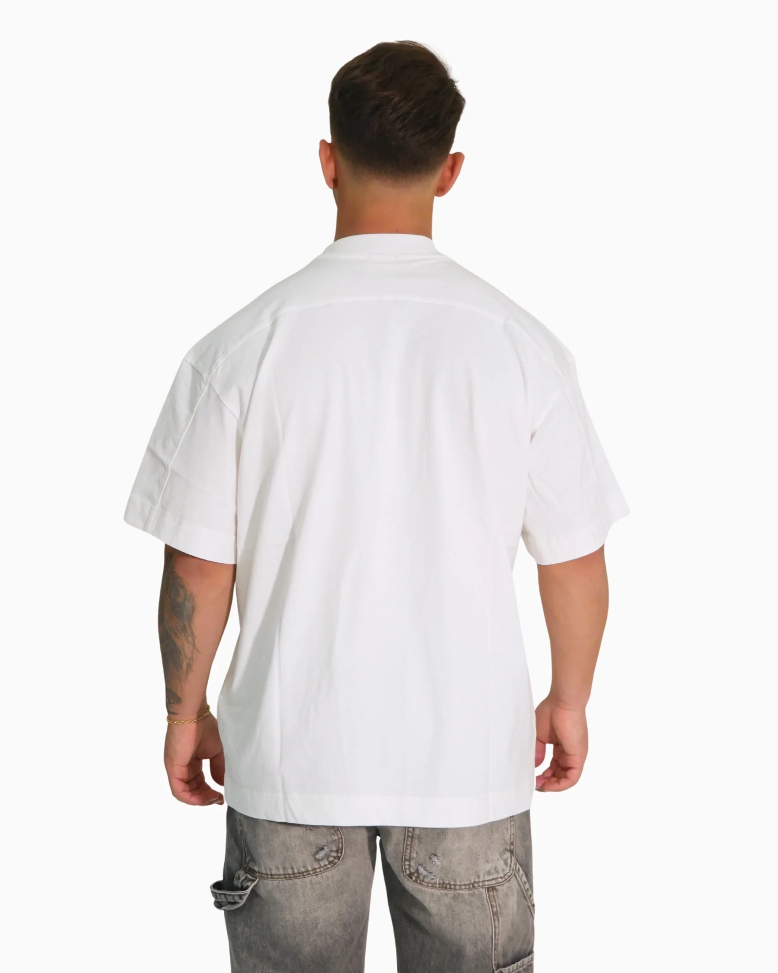 T-shirt in 100% cotone dalla mano morbida e struttura compatta. Presenta collo mock (girocollo leggermente alto), spalla scesa e linea relaxed/over per una vestibilità moderna.