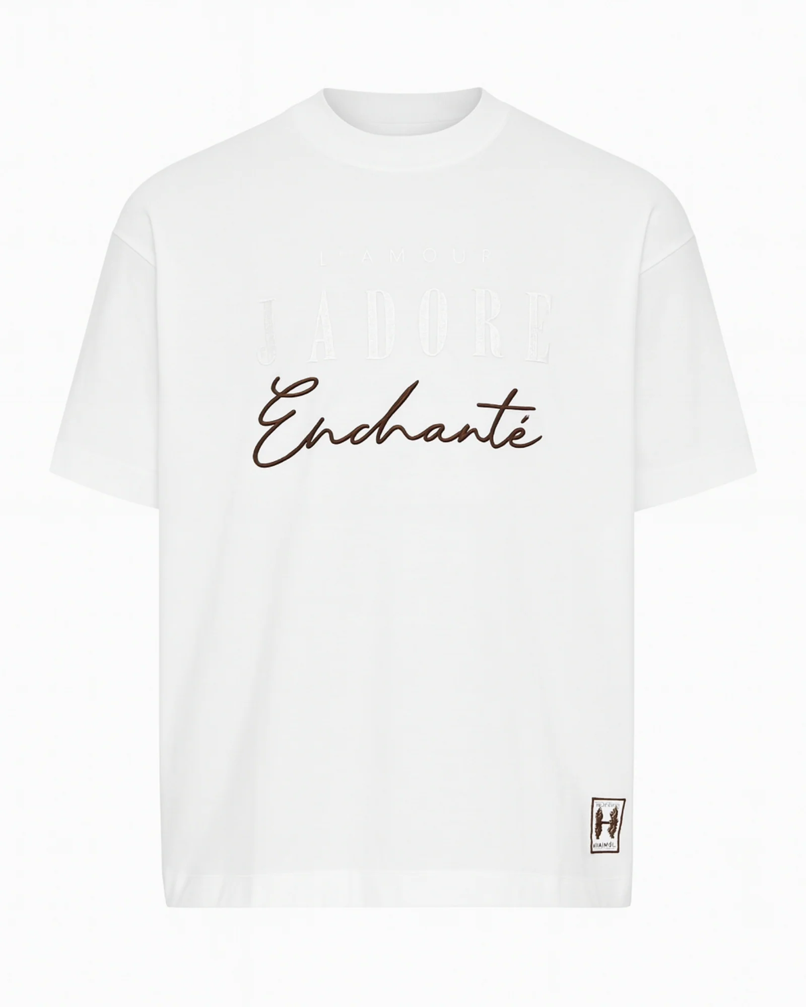 Sul davanti spicca la grafica “J’ADORE / L’AMOUR / JE T’AIME / Enchanté” realizzata con ricamo e applicazione a rilievo che dona profondità al design.