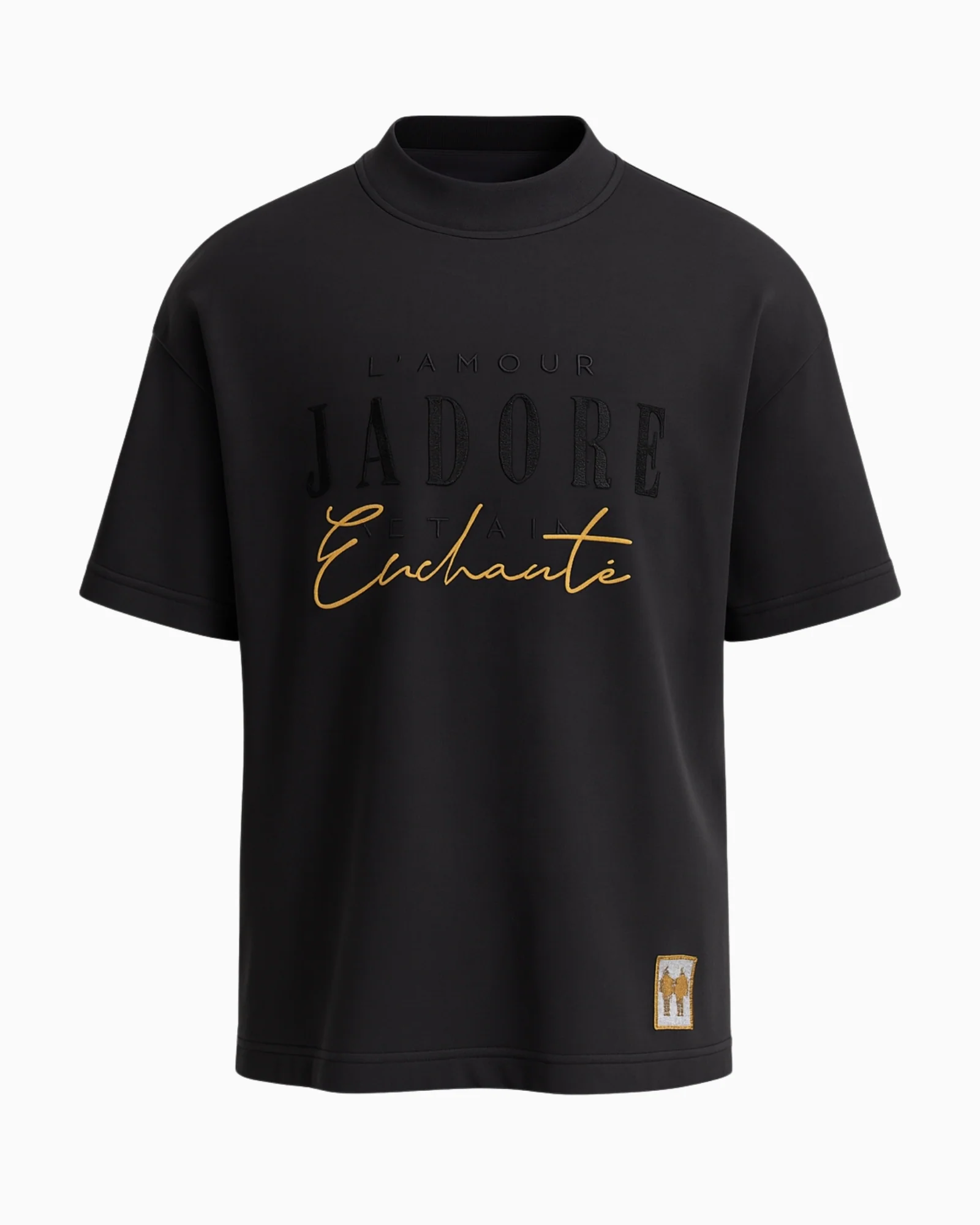 Sul davanti spicca la grafica “J’ADORE / L’AMOUR / JE T’AIME / Enchanté” realizzata con ricamo e applicazione a rilievo che dona profondità al design.