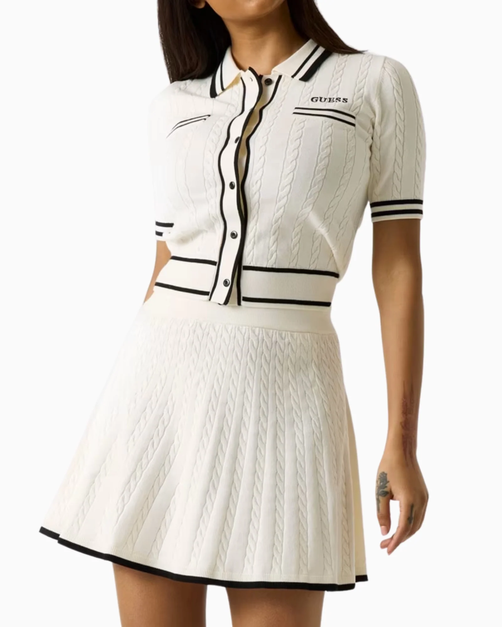 GUESSGonna a maglia intrecciatanome prodotto: ShariCodice prodotto: V6RD07 Z4652 G1O6 Dettagli: Mini gonna maglione.Plissettata.Vita alta.Misto viscosa.Intrecciata. La modella indossa la taglia S.Lunghezza totale: 27 cm / 15 pollici. Vestibilitร conforme alla taglia prescelta.
