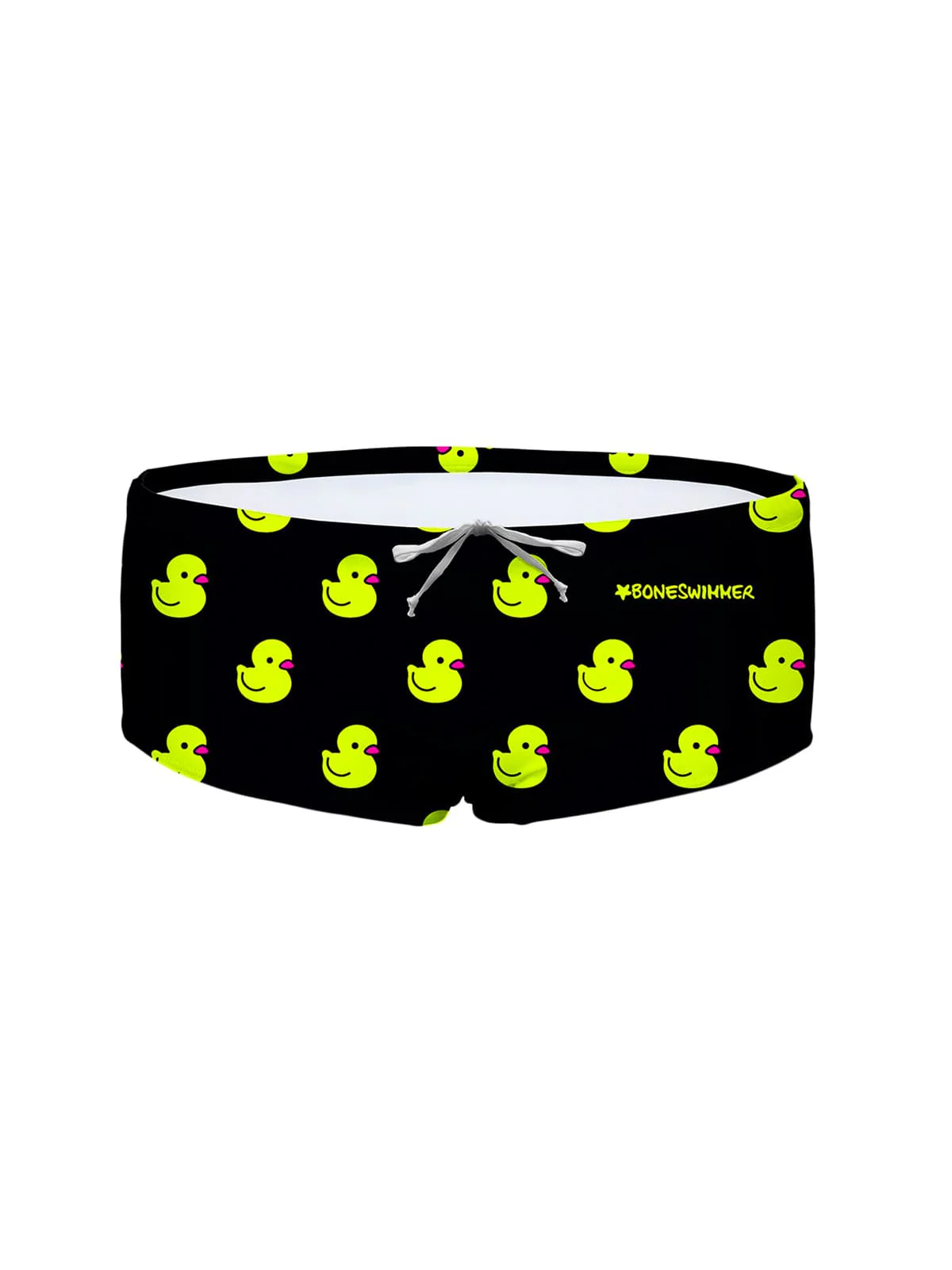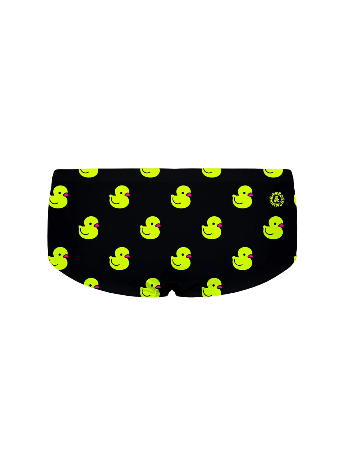 Stampa: piccole paperelle giallo fluo su sfondo nero, per un look giocoso e audace.