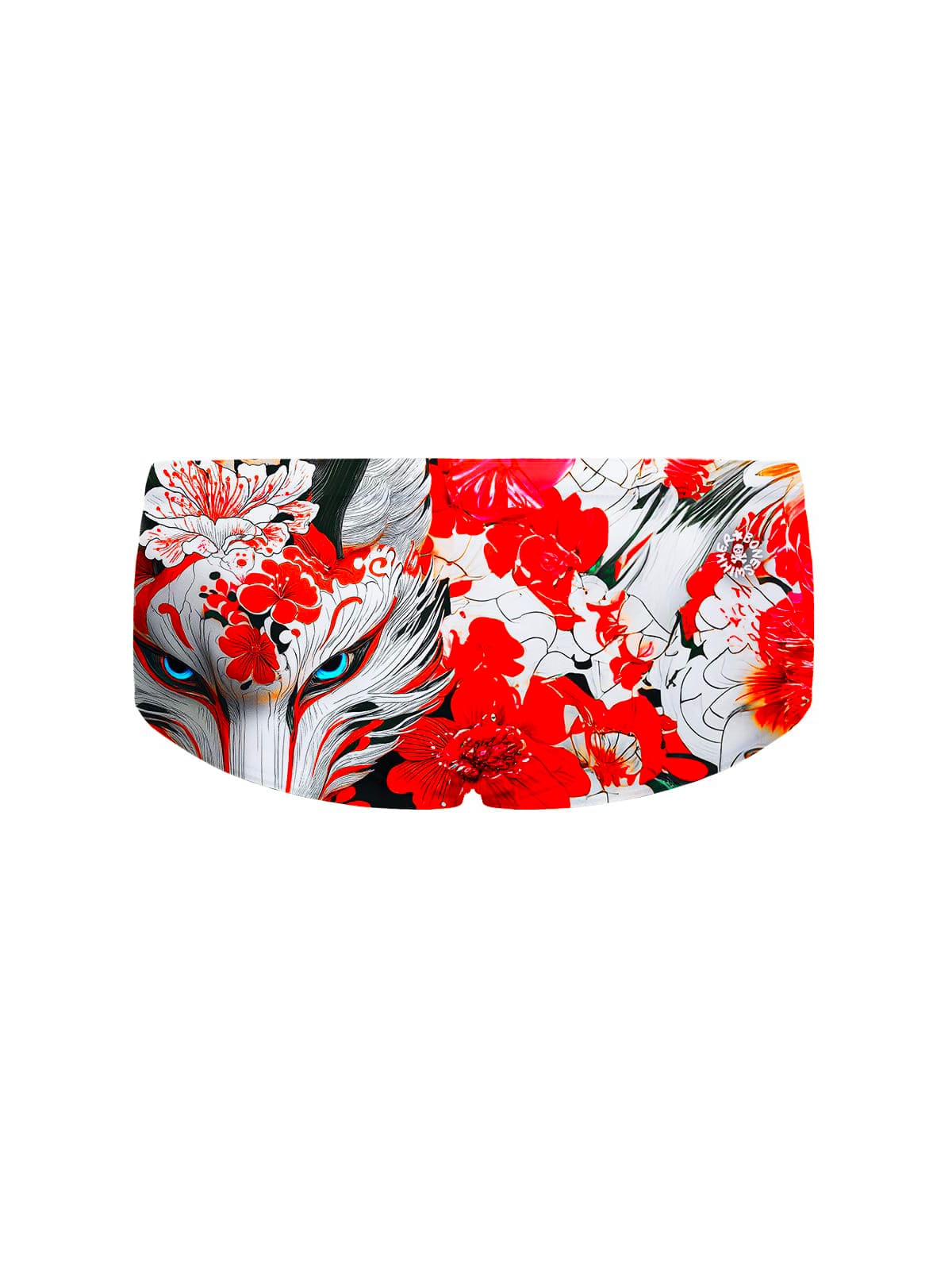 Stile: una volpe Kitsune, figura mitologica giapponese, con occhi blu penetranti, circondata da fiori rossi su sfondo bianco e nero. Un design mistico e affascinante per chi vuole portare con sé la magia del Giappone anche in piscina.