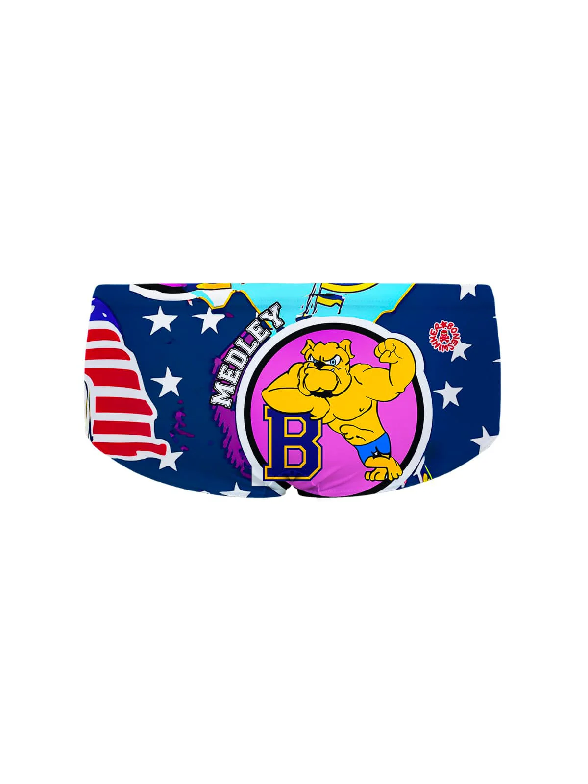 Costume parigamba da allenamento, modello Ucla. Stampa “Medley”: un mix di grafiche decise e colori a contrasto per un’energia esplosiva in vasca, ispirata all’estetica college USA.