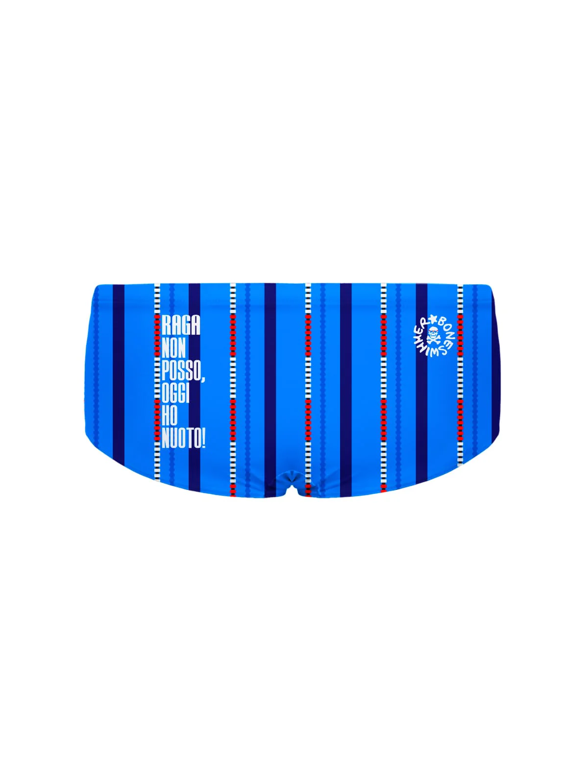 Un costume che nasce dallo sguardo di chi vive la piscina come una seconda casa. Le corsie di nuoto, disegnate in stile vettoriale pulito e ordinato, non sono solo un elemento decorativo: rappresentano la disciplina, la costanza e la direzione chiara che caratterizzano un nuotatore. Le tonalità di blu richiamano la calma apparente dell’acqua, ma sotto la superficie si percepisce energia, forza e determinazione.