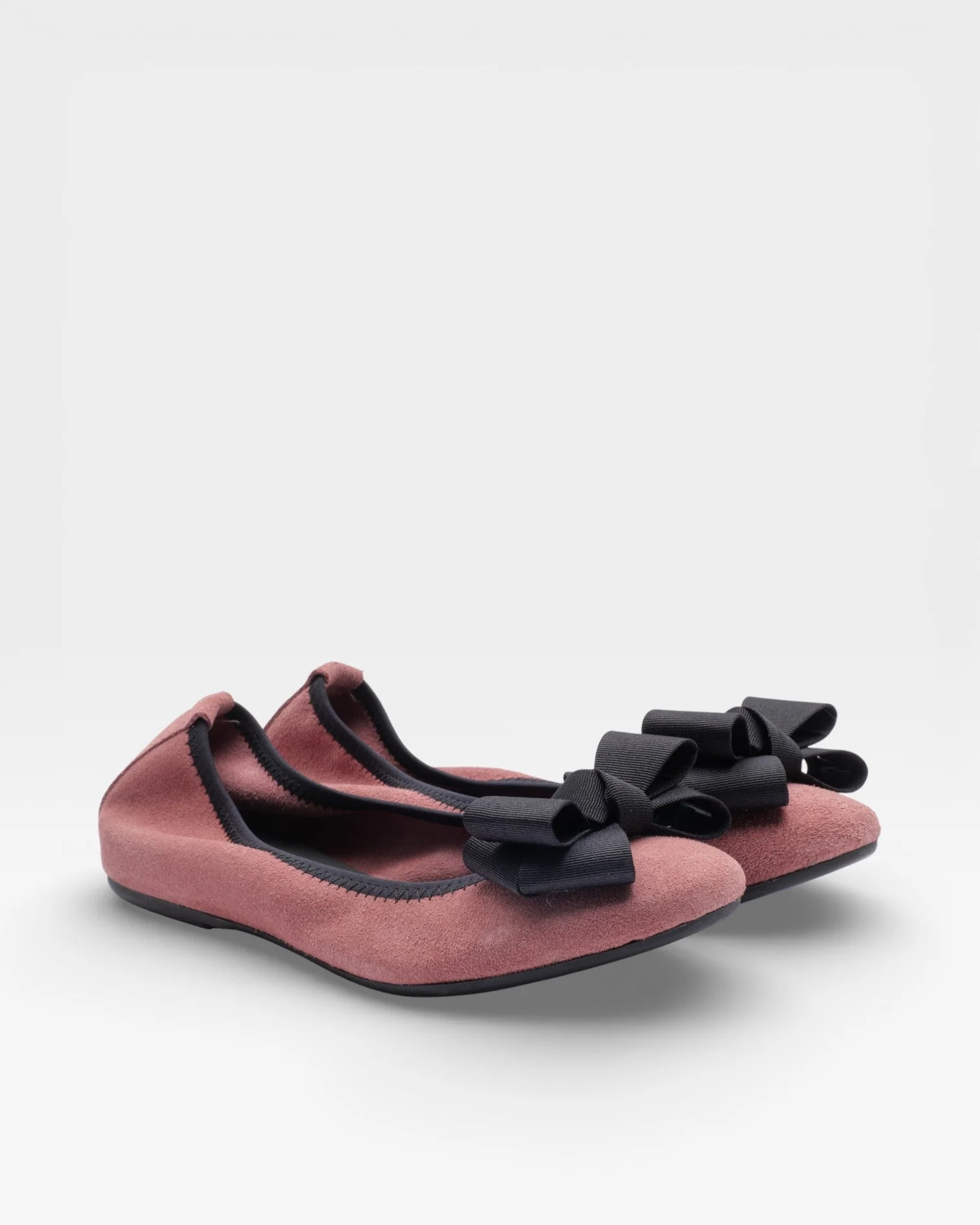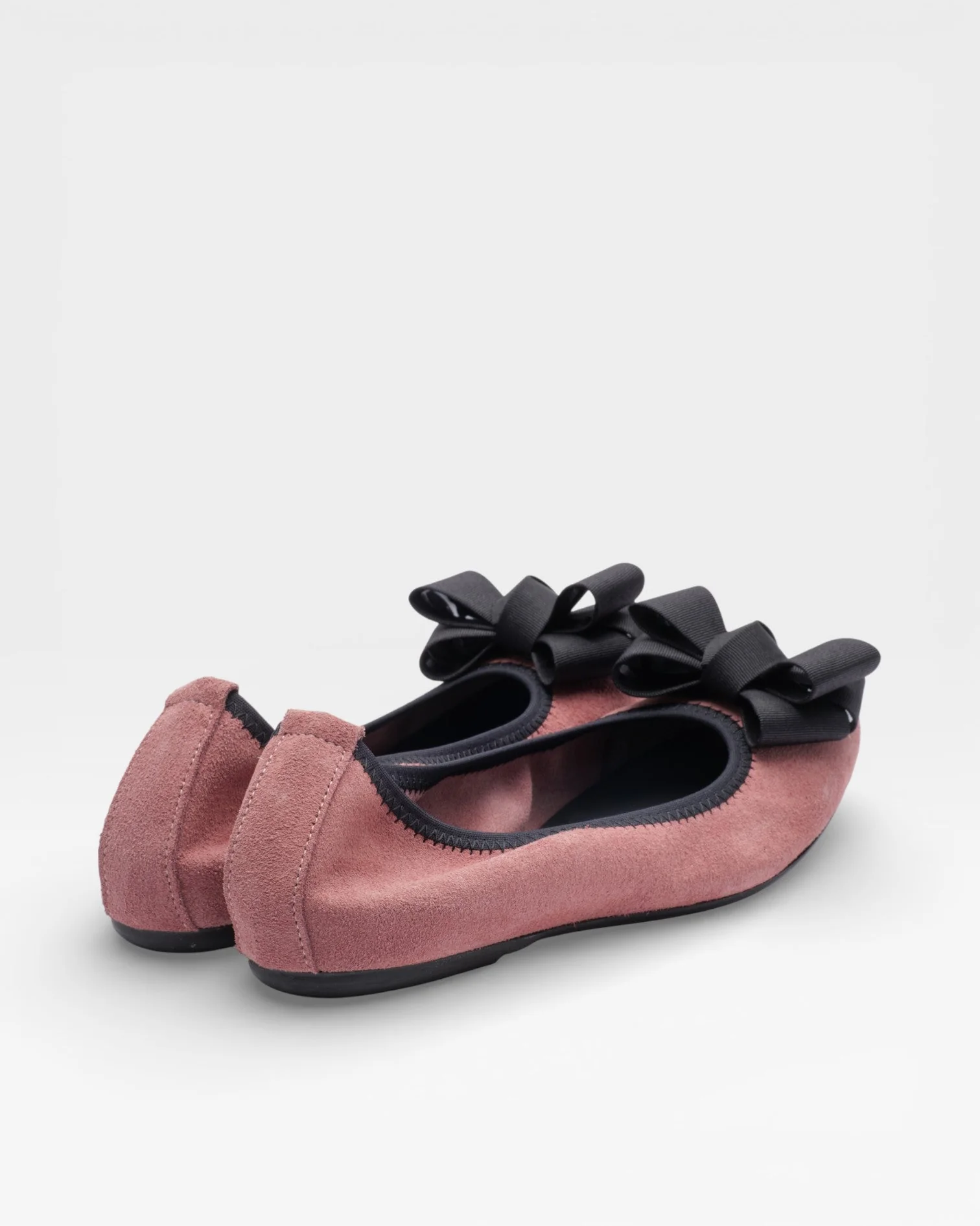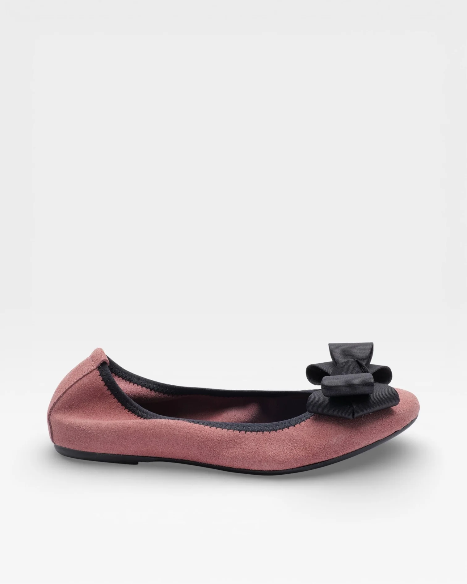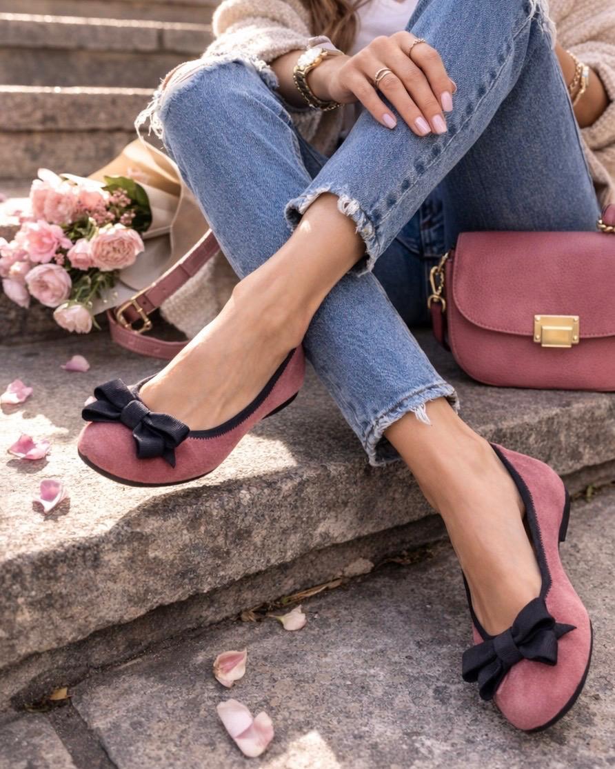 Ballerina in velour di camoscio rosa antico con fiocco in gros-grain testa di moro e rialzo interno di 1,5cm antitallonite. Delicata ma strutturata, perfetta per la Primavera Estate 2026.