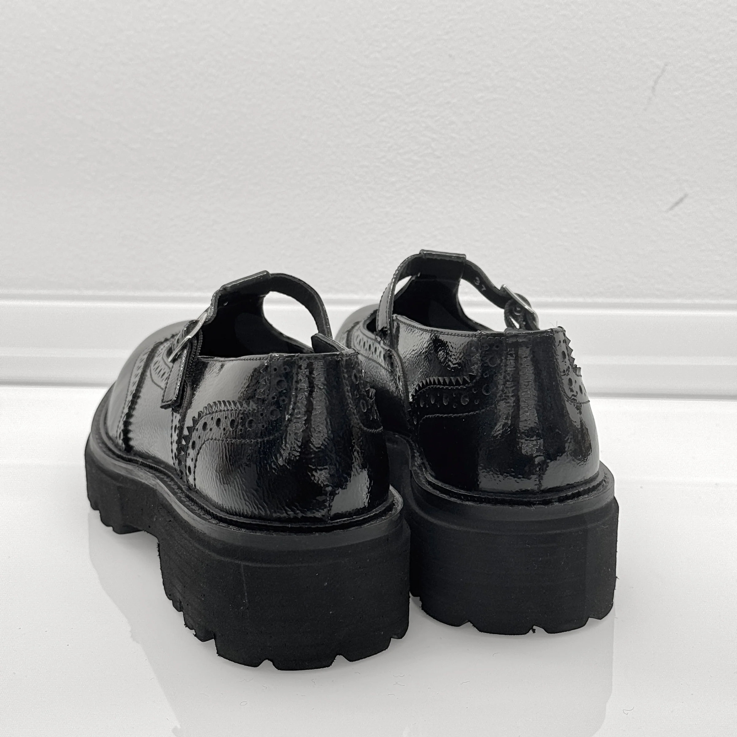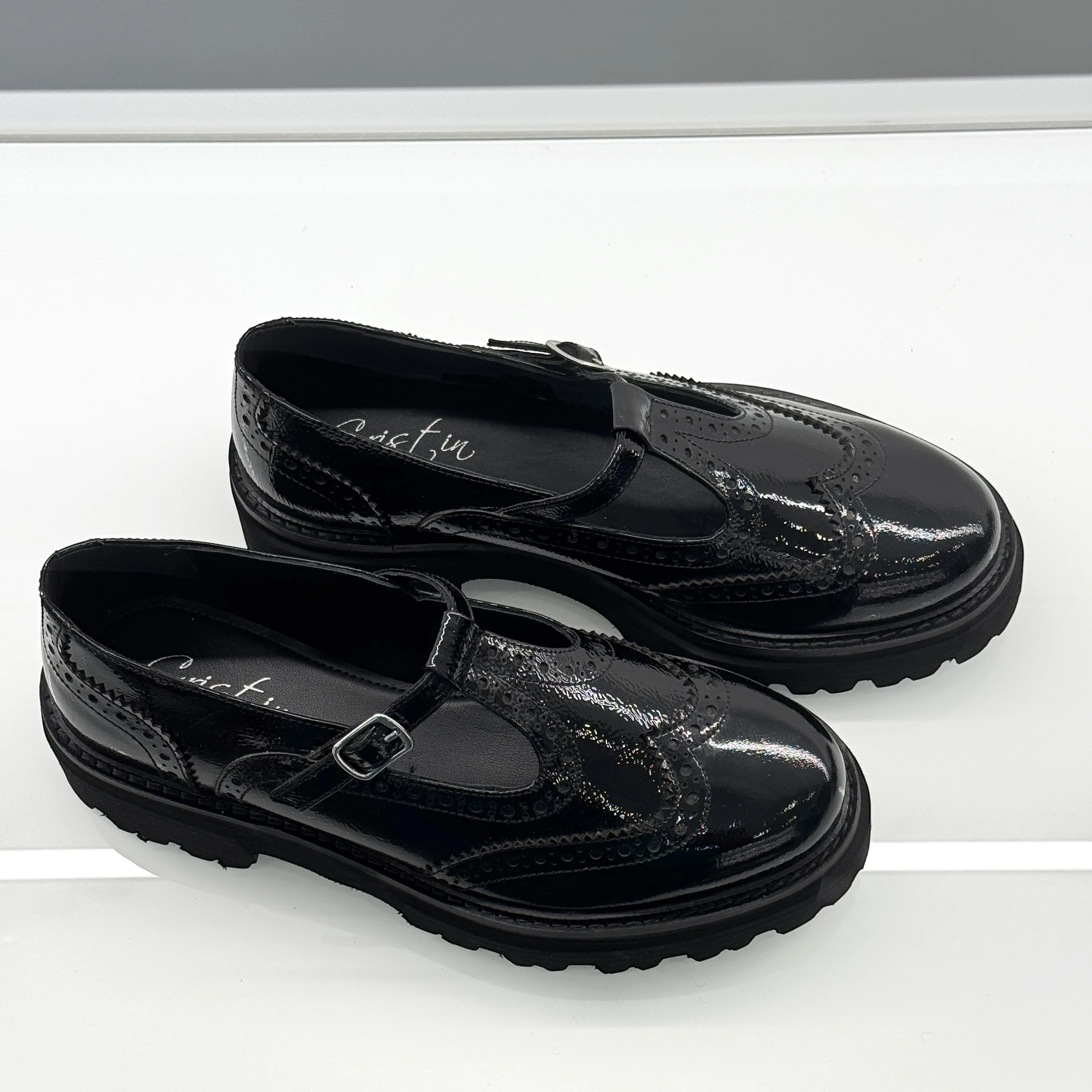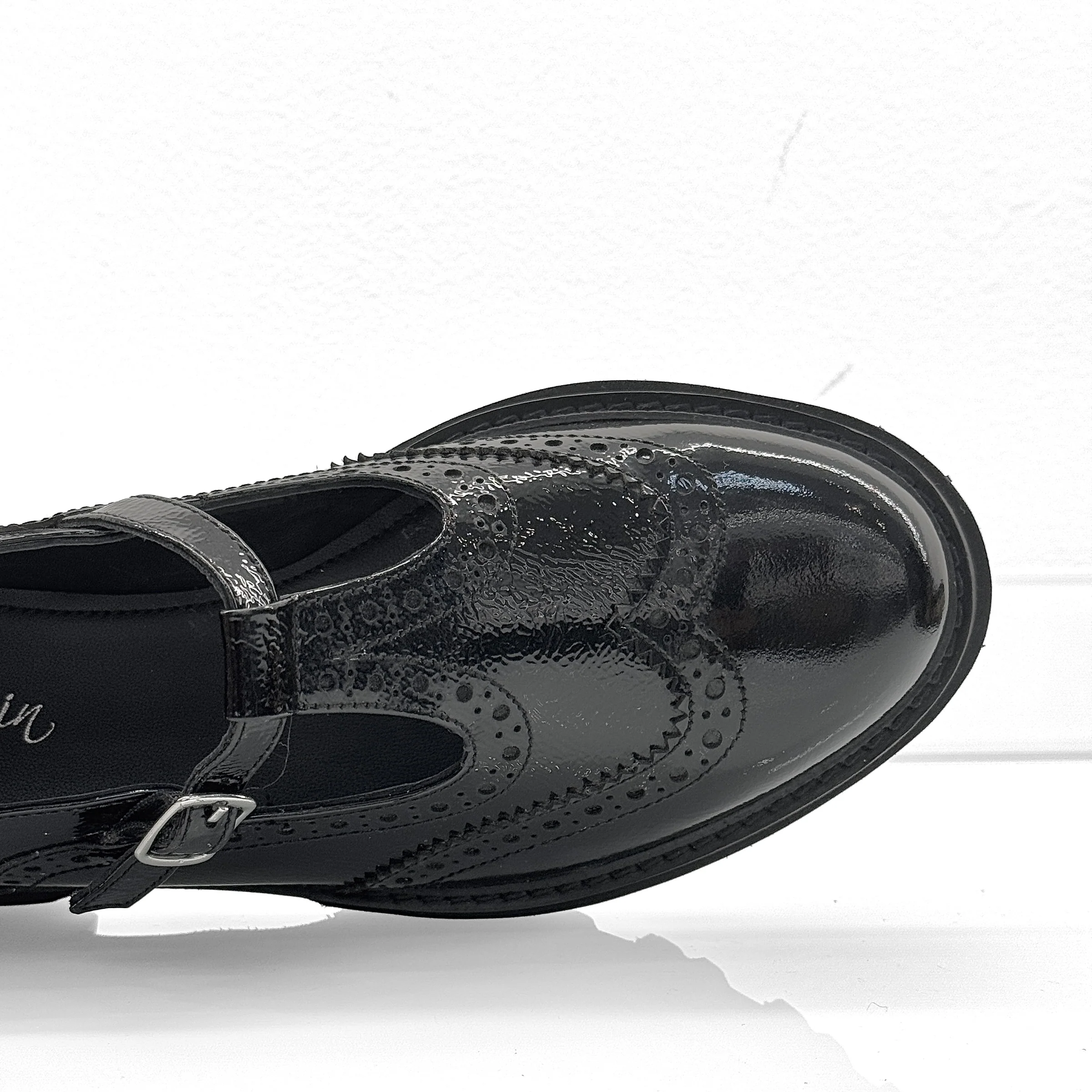 Scarpa bebè Beatrix in pelle verniciata nera con cinturino, traforata e suola carrarmato in gomma. Lucida, sicura, contemporanea.
