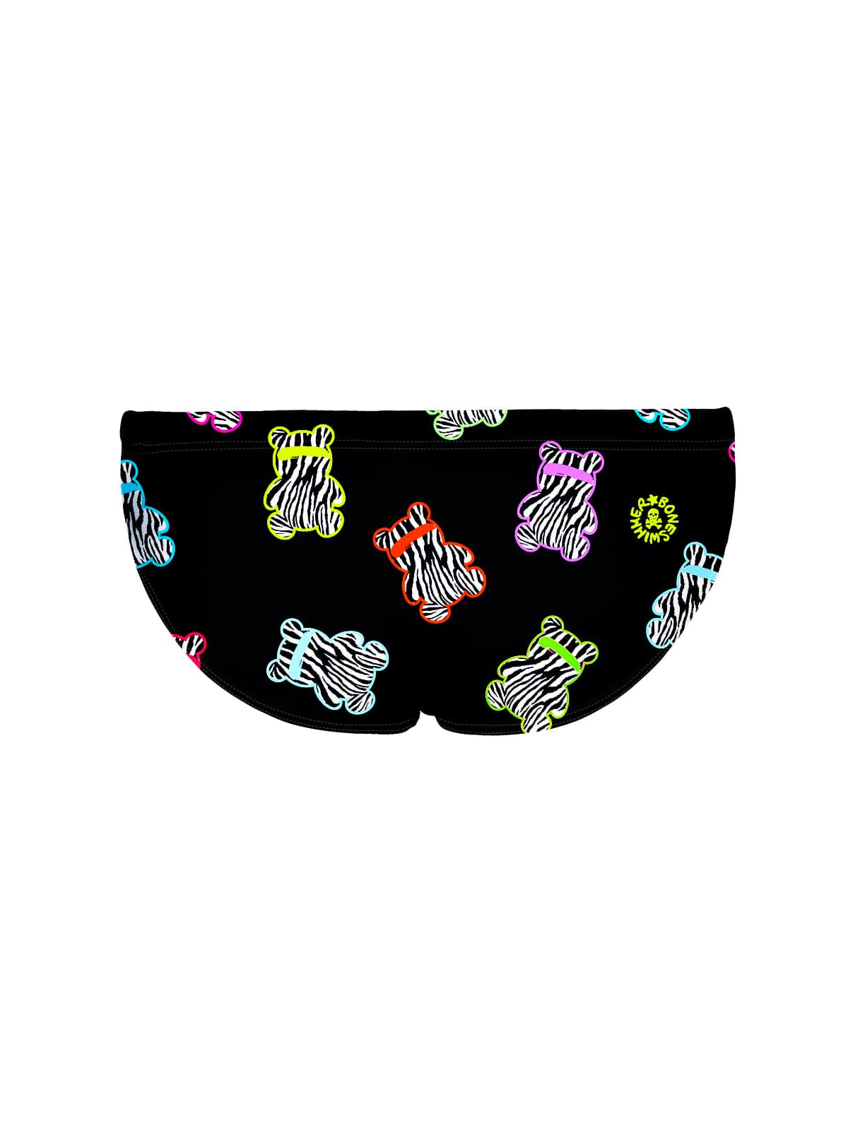 Costume slip da allenamento, modello H2Otto. Stampa “Abibò”: orsetti gommosi zebrati e multicolore con profili fluo su base nera – un look ironico e vivace.