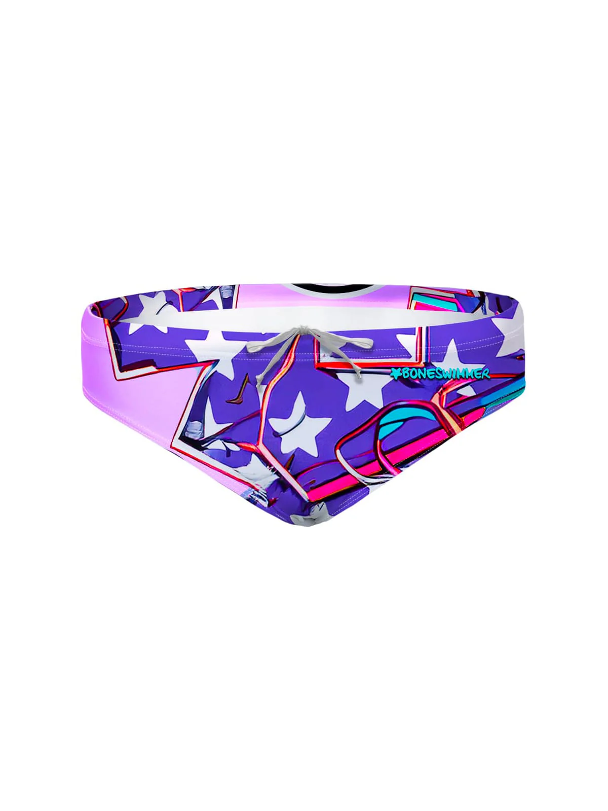 Costume slip da allenamento per uomo, modello H2Otto. Stampa “Fly”: un delfino-mascotte in stile college, stelle e un design pop per chi ama il nuoto a farfalla.