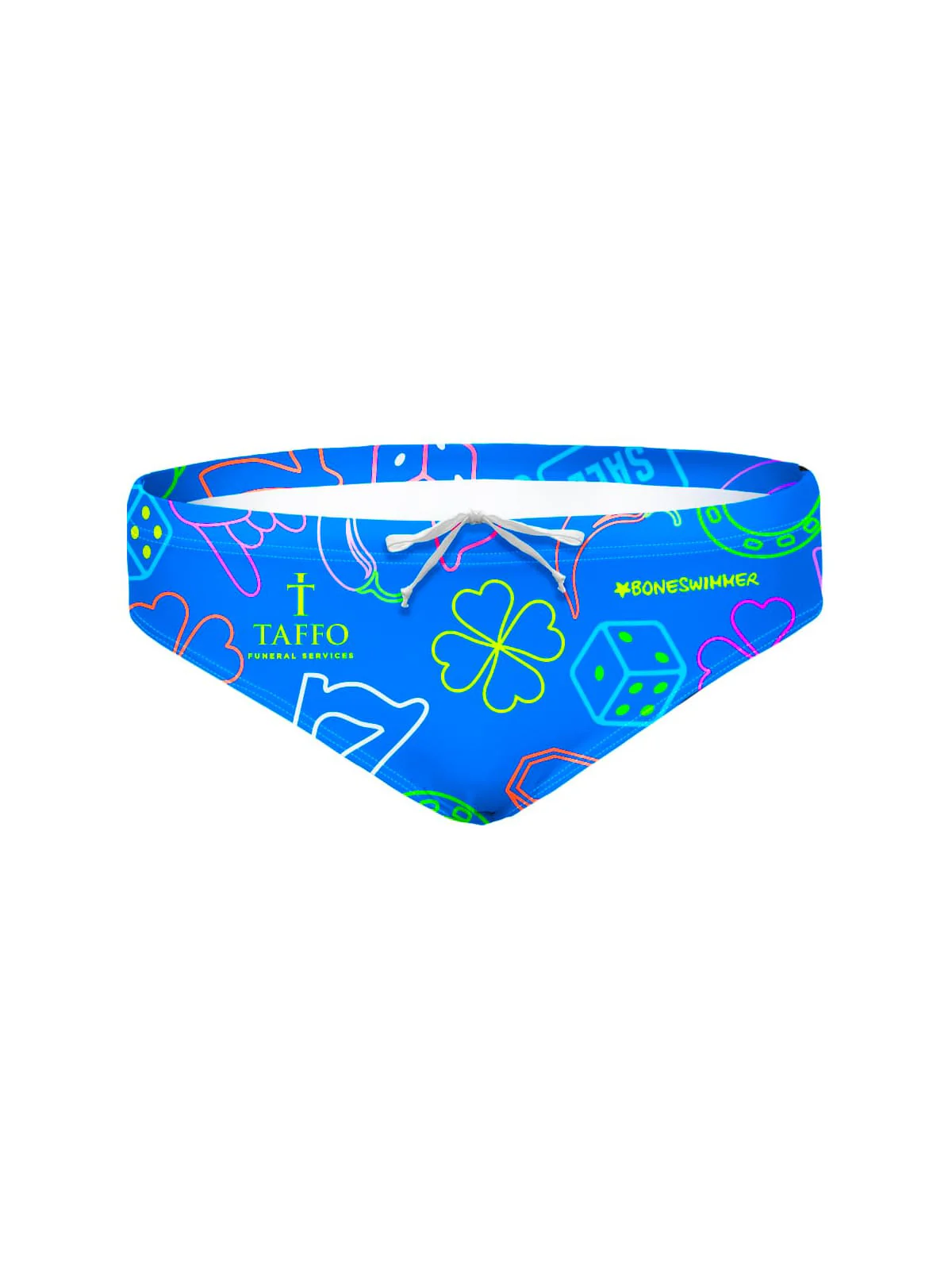 Stile: lo stile del costume รจ clamorosamente ironico e gioca sui simboli scaramantici, realizzati con illustrazioni in outline a colori fluo sul fondo blu elettrico, come una bara, il quadrifoglio, le corna, il ferro di cavallo, il peperoncino o cornetto ecc. La frase “Morto a galla” รจ un gioco di parole con la posizione del morto in acqua, strizzando l’occhio al contesto nuoto in piscina di Boneswimmer, che nei suoi elementi iconici come gli scheletri, i teschi e le ossa, vanta giร una tradizione iconografica in sintonia.