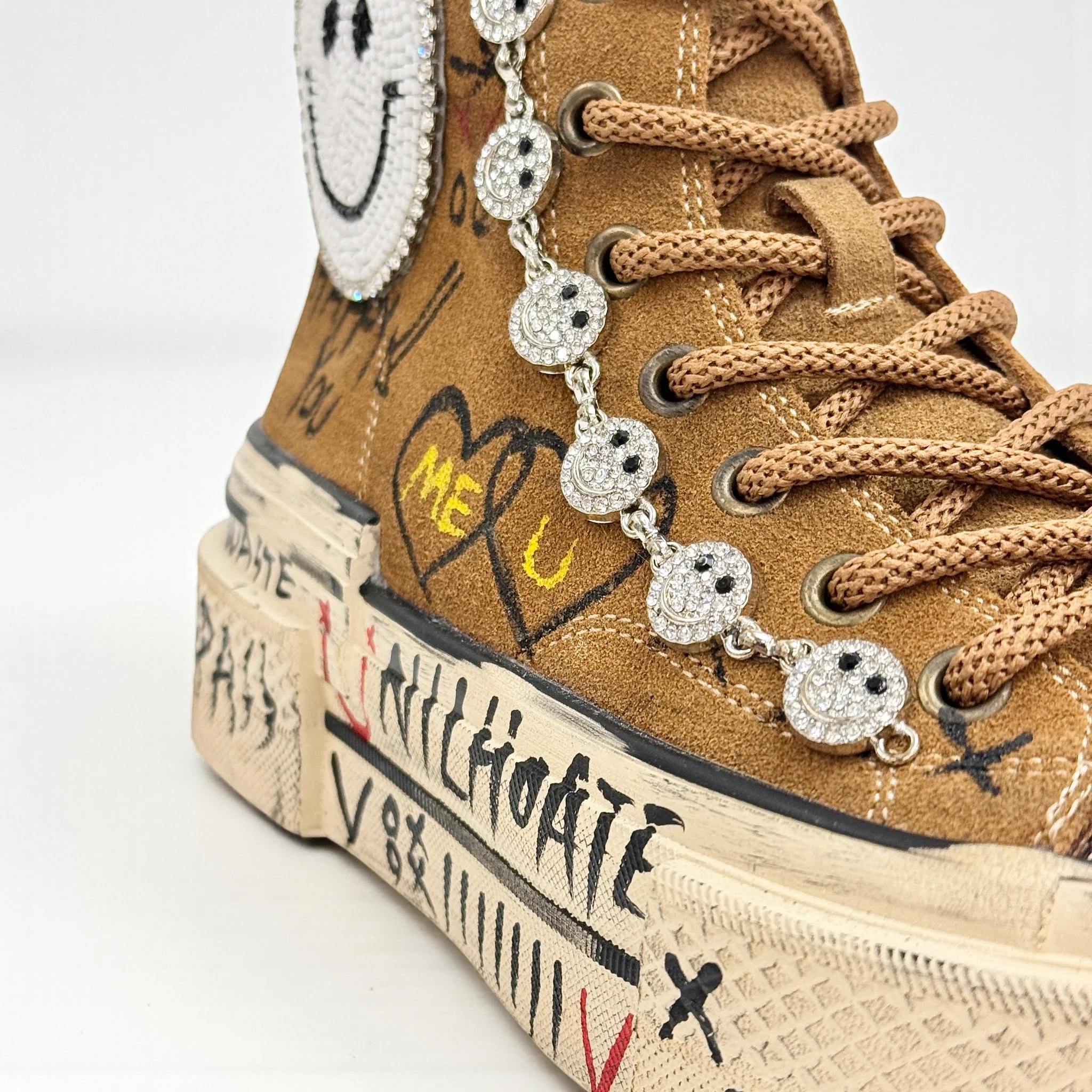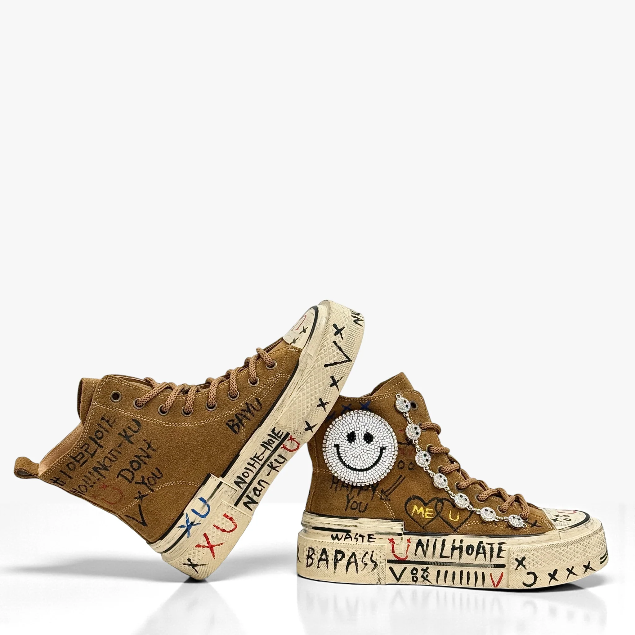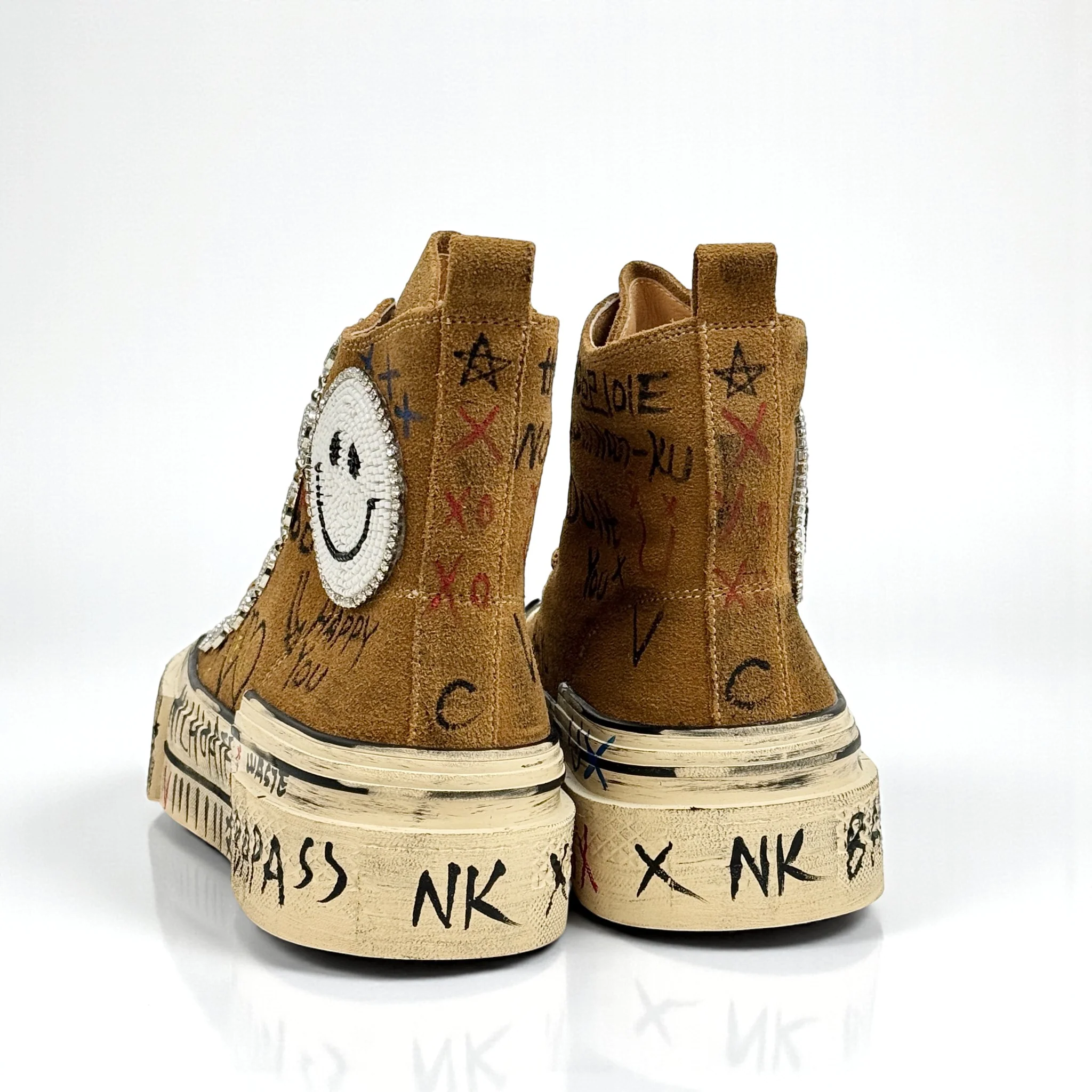 Nanku รจ una sneakers alta in camoscio dal carattere rock e artistico, arricchita da dettagli unici realizzati a mano. Lo smiley in cristalli, le applicazioni gioiello e le grafiche disegnate rendono ogni paio una creazione originale e di forte personalitร .