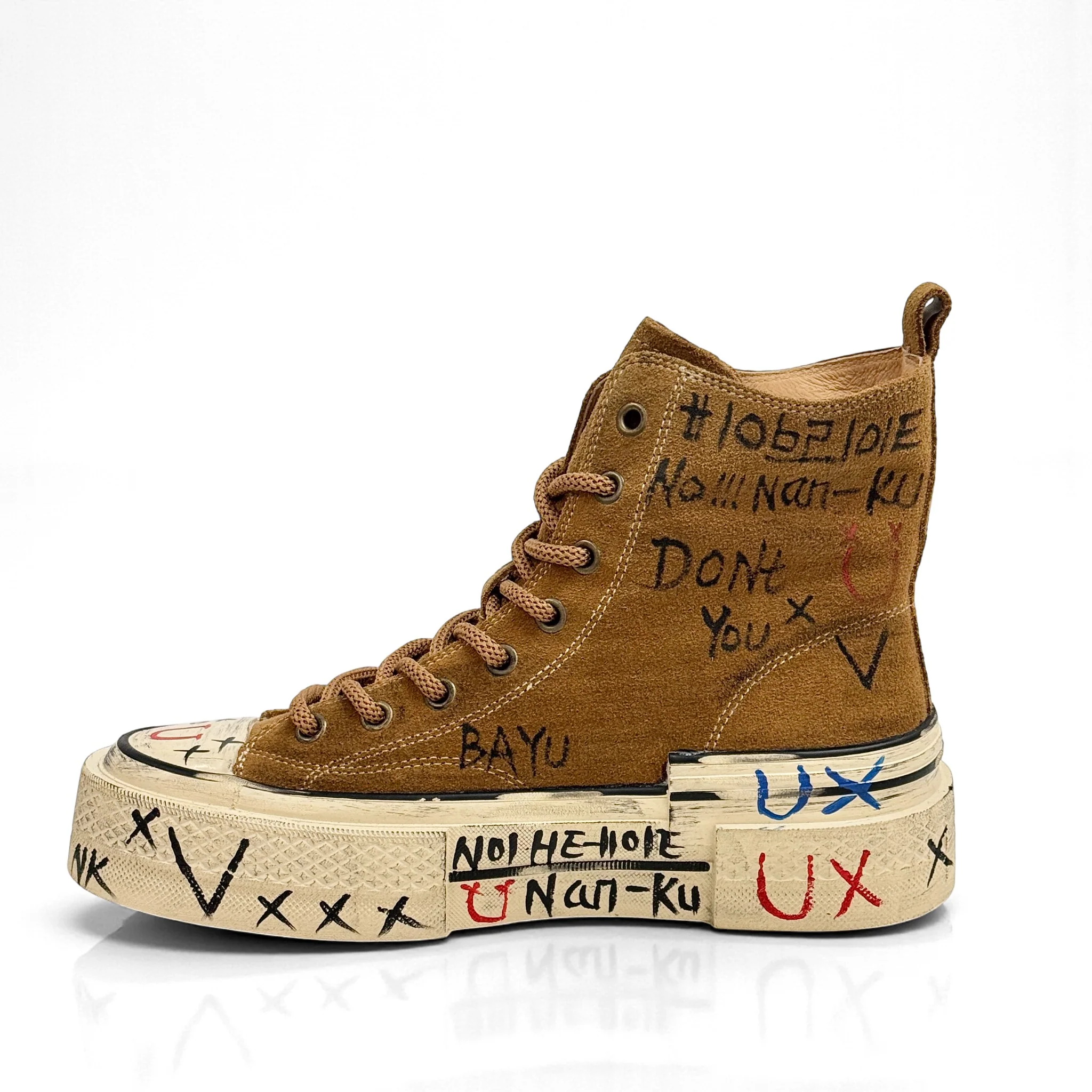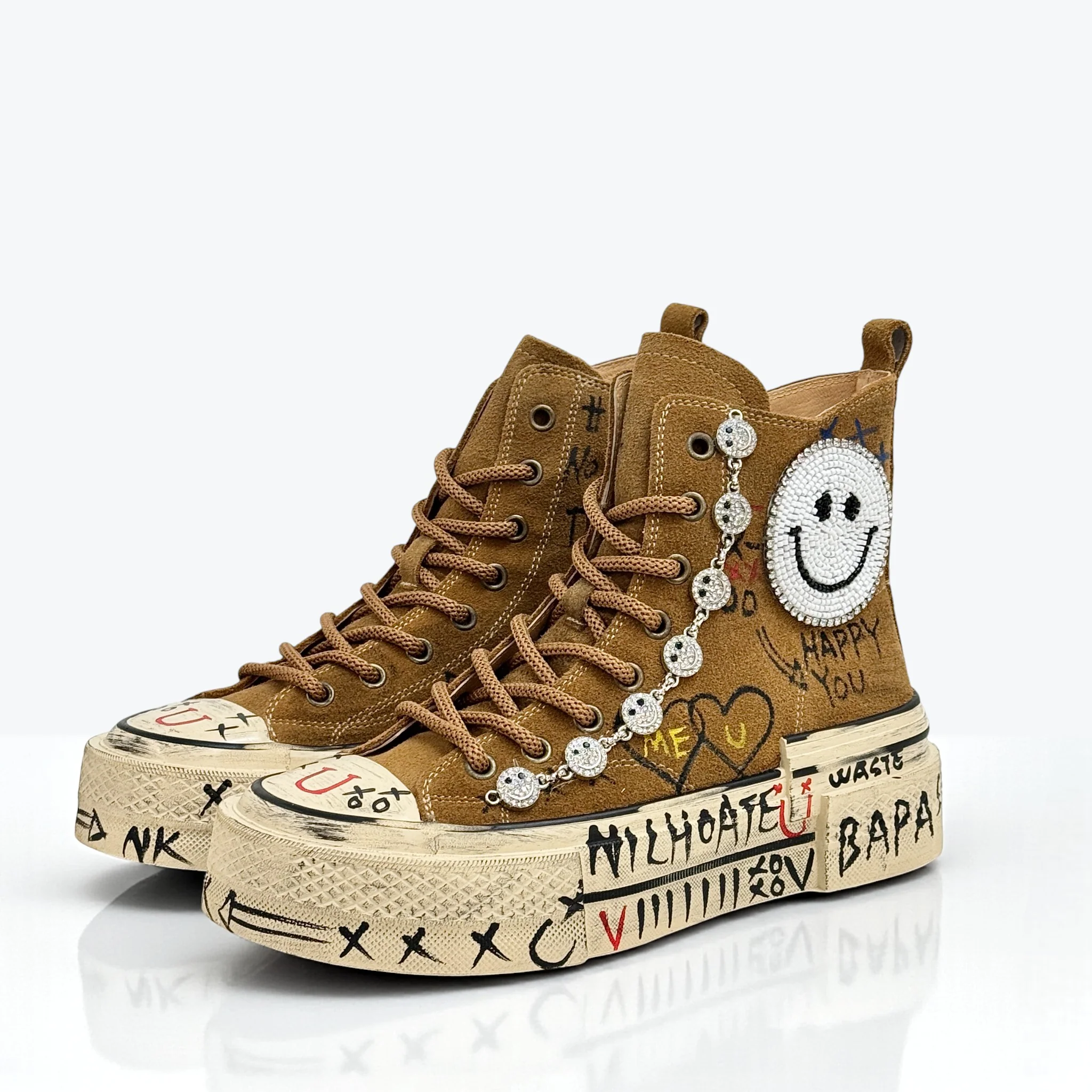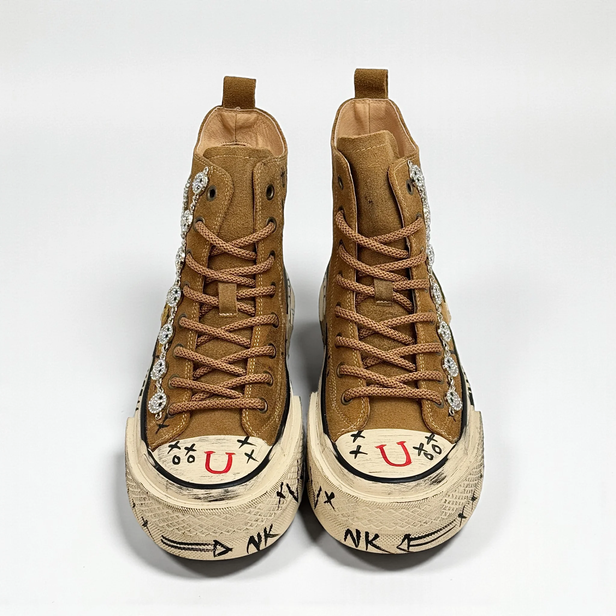 Nanku รจ una sneakers alta in camoscio dal carattere rock e artistico, arricchita da dettagli unici realizzati a mano. Lo smiley in cristalli, le applicazioni gioiello e le grafiche disegnate rendono ogni paio una creazione originale e di forte personalitร .