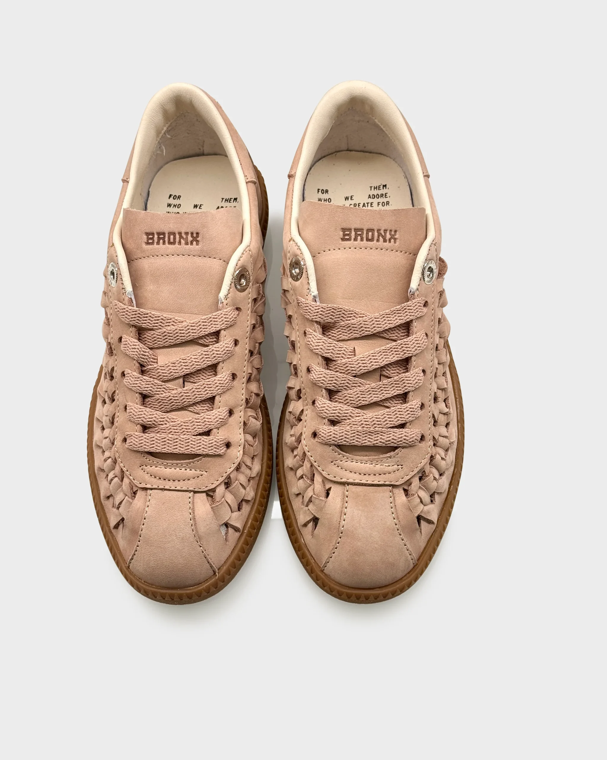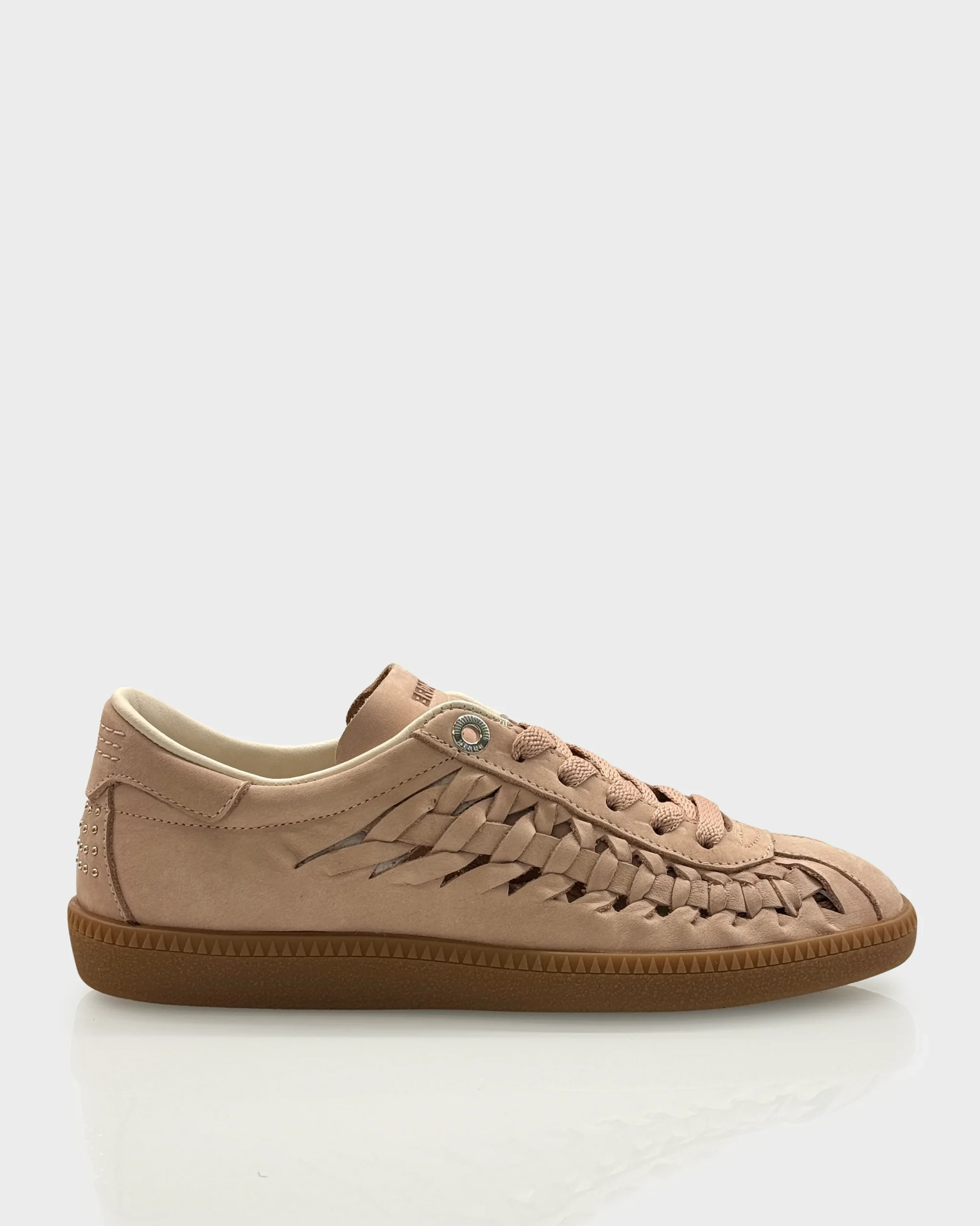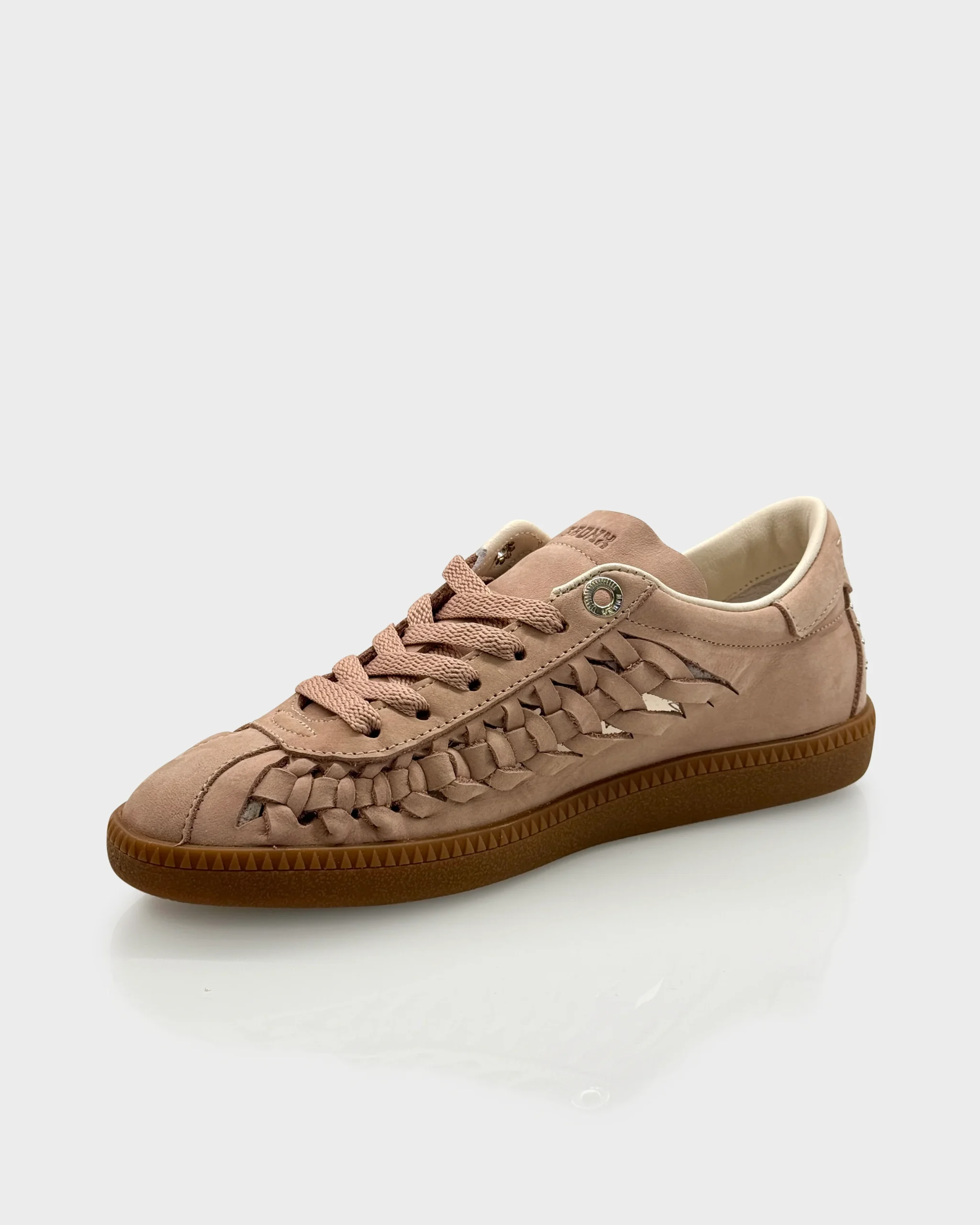 Sneakers donna in nabuk morbido color Blush con suola gum e dettaglio intrecciato sul tallone. Un modello contemporaneo e ricercato, impreziosito da microborchie sul tallone che donano carattere senza appesantire la linea.