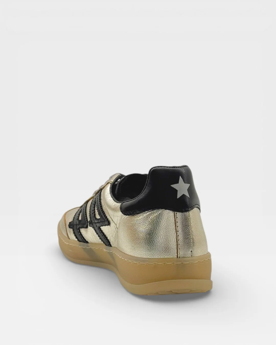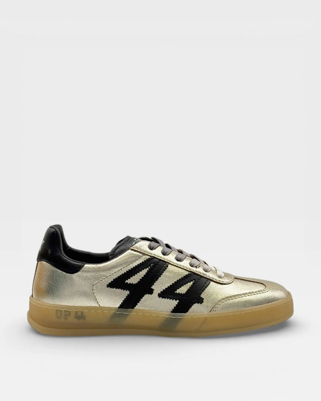 Sneakers donna in pelle laminata platino con dettagli neri a contrasto e suola color miele. Un modello luminoso ma deciso, perfetto per chi ama uno stile sport chic contemporaneo.