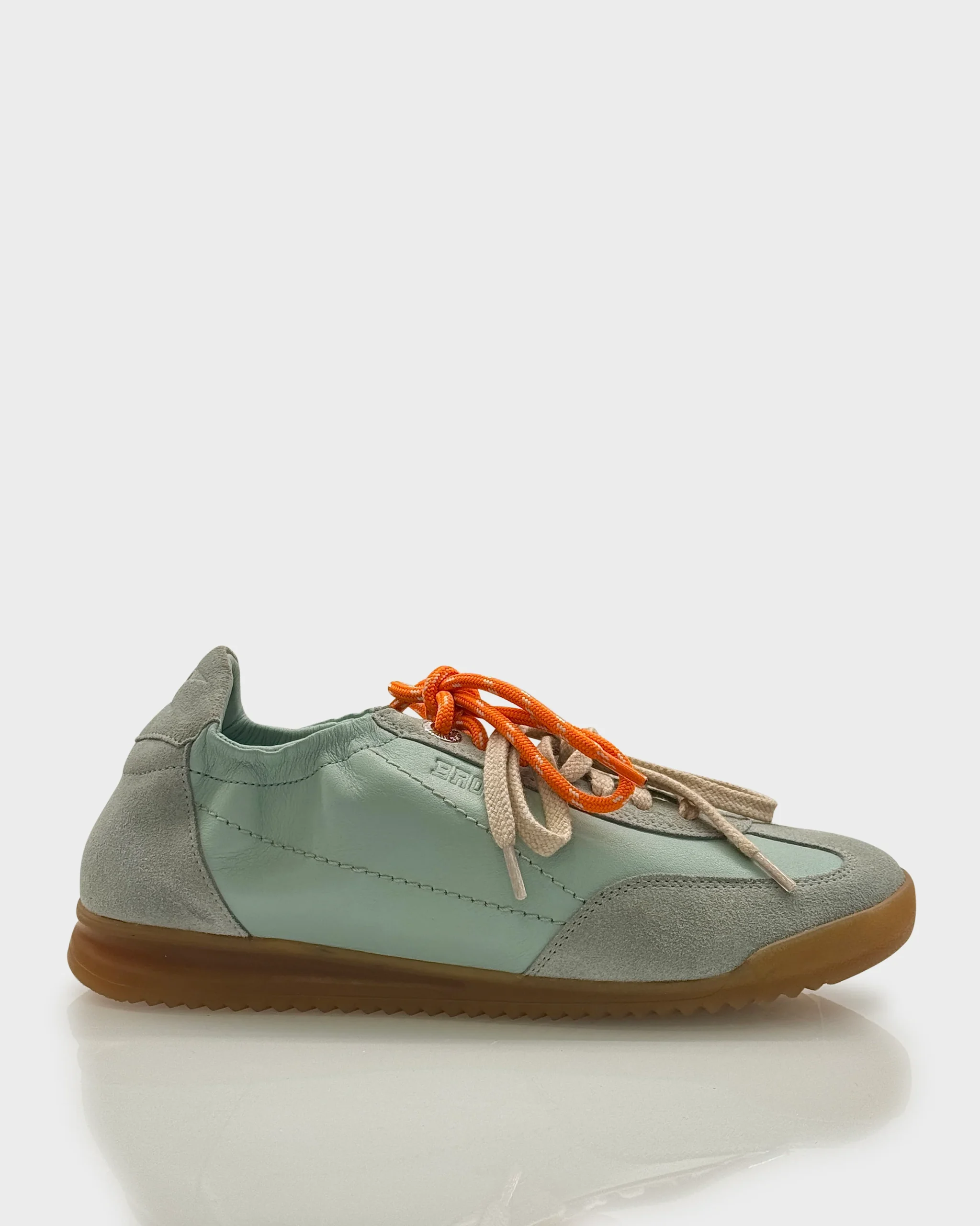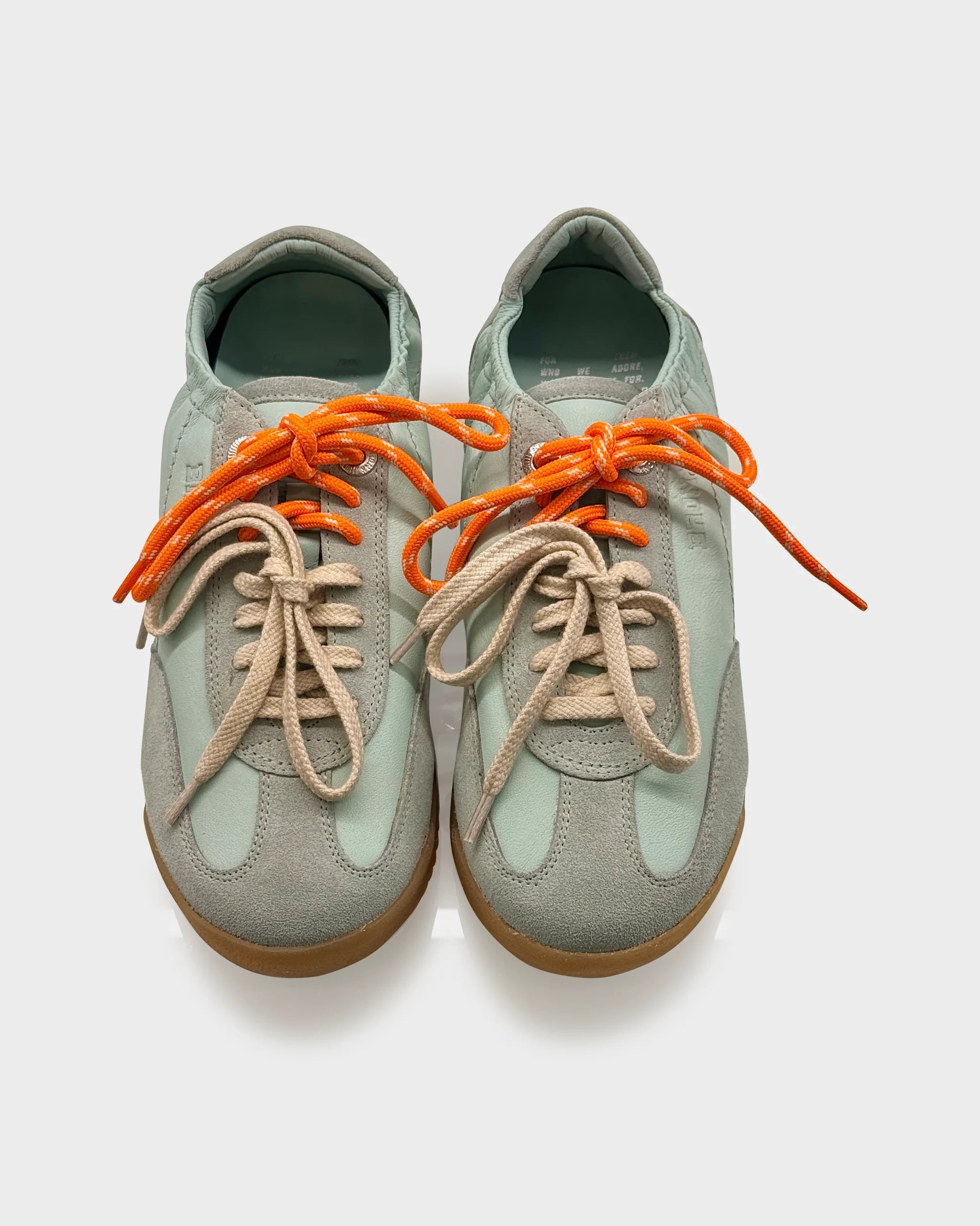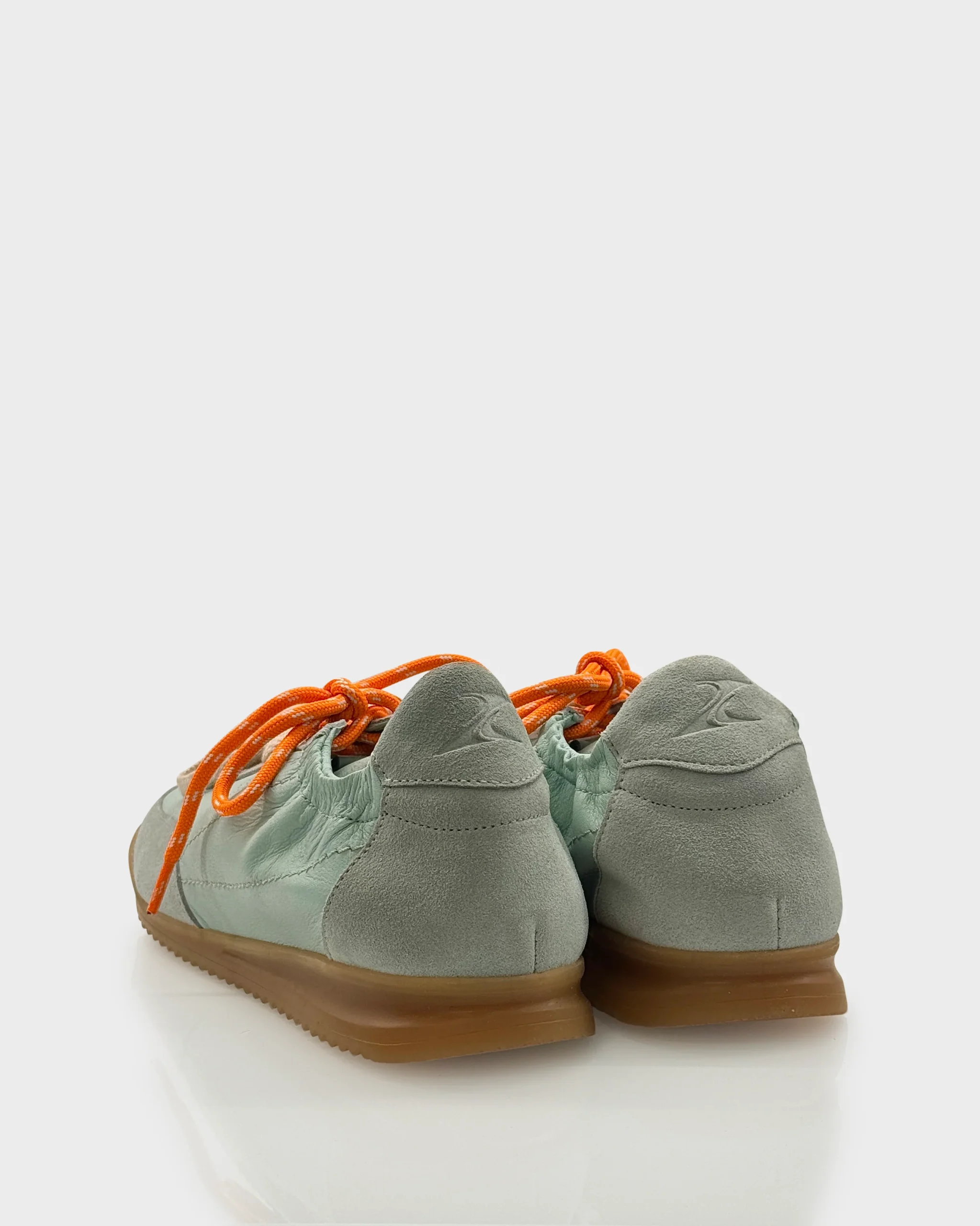 Sneakers donna in pelle morbida color Acqua Sage con inserti in suede e lacci a contrasto. Linea retro running rivisitata in chiave contemporanea, comoda e versatile per tutti i giorni.