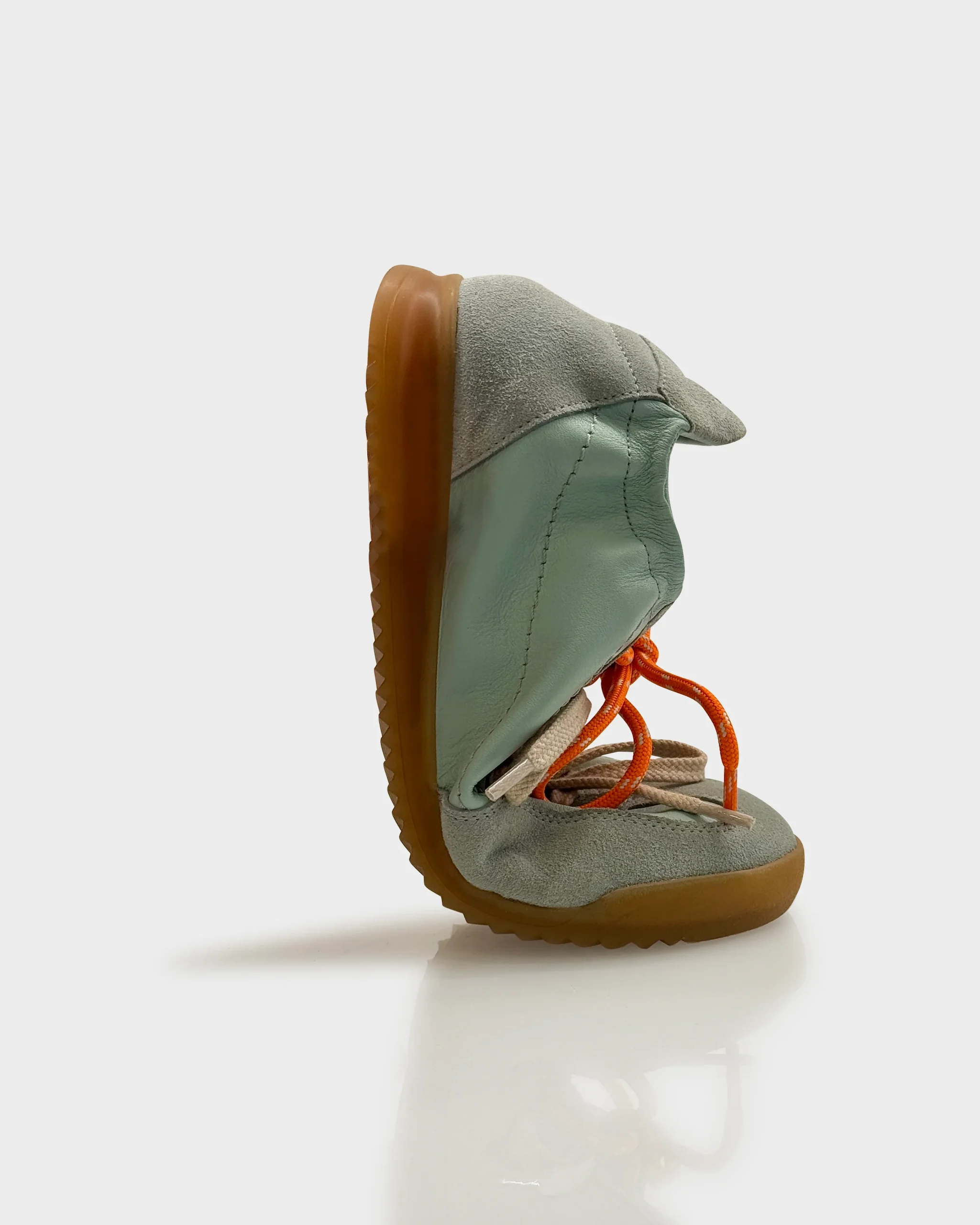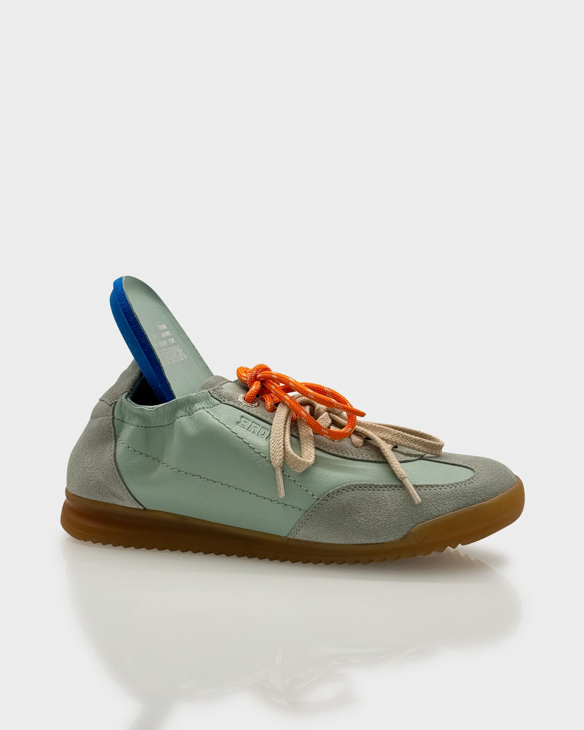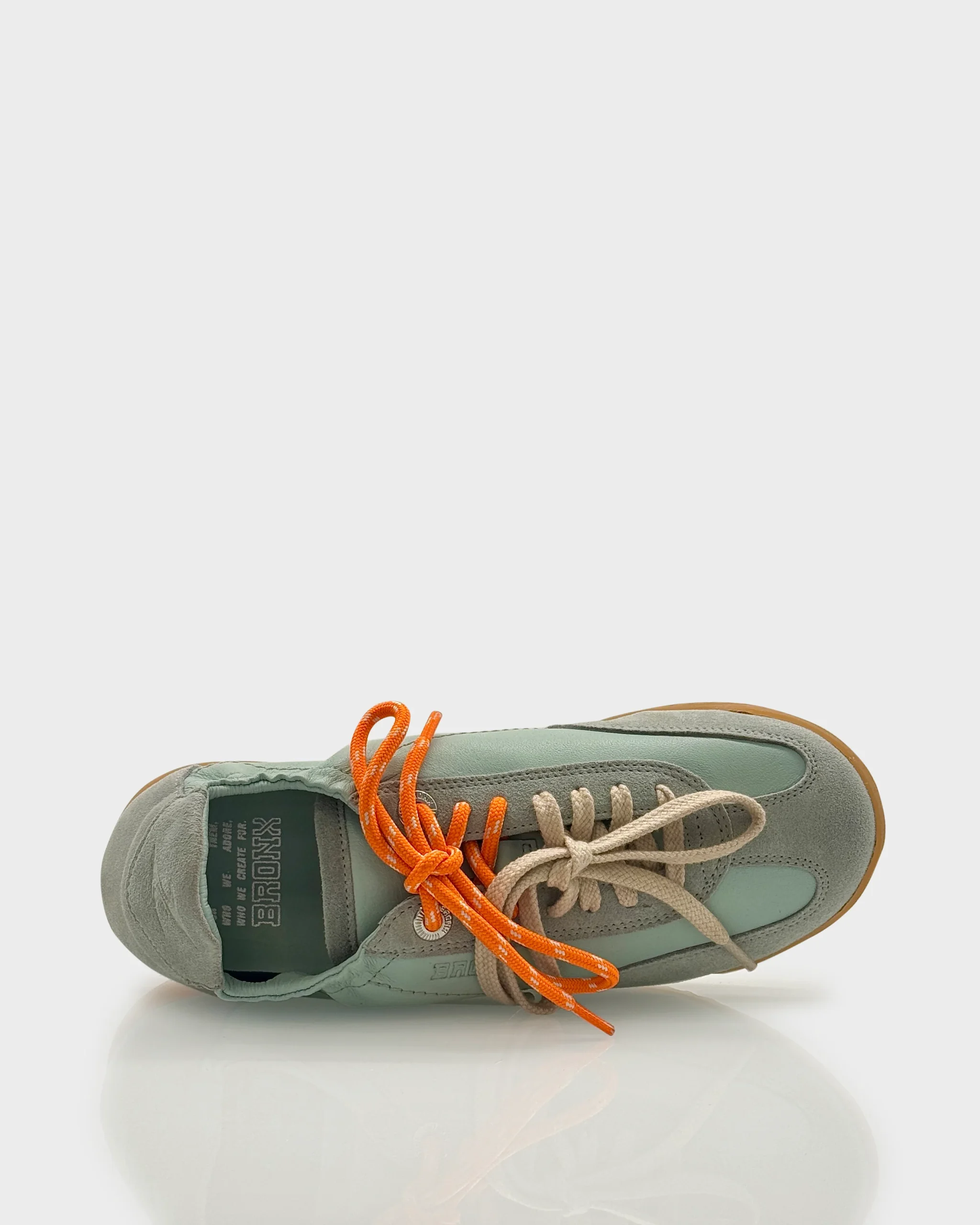 Sneakers donna in pelle morbida color Acqua Sage con inserti in suede e lacci a contrasto. Linea retro running rivisitata in chiave contemporanea, comoda e versatile per tutti i giorni.