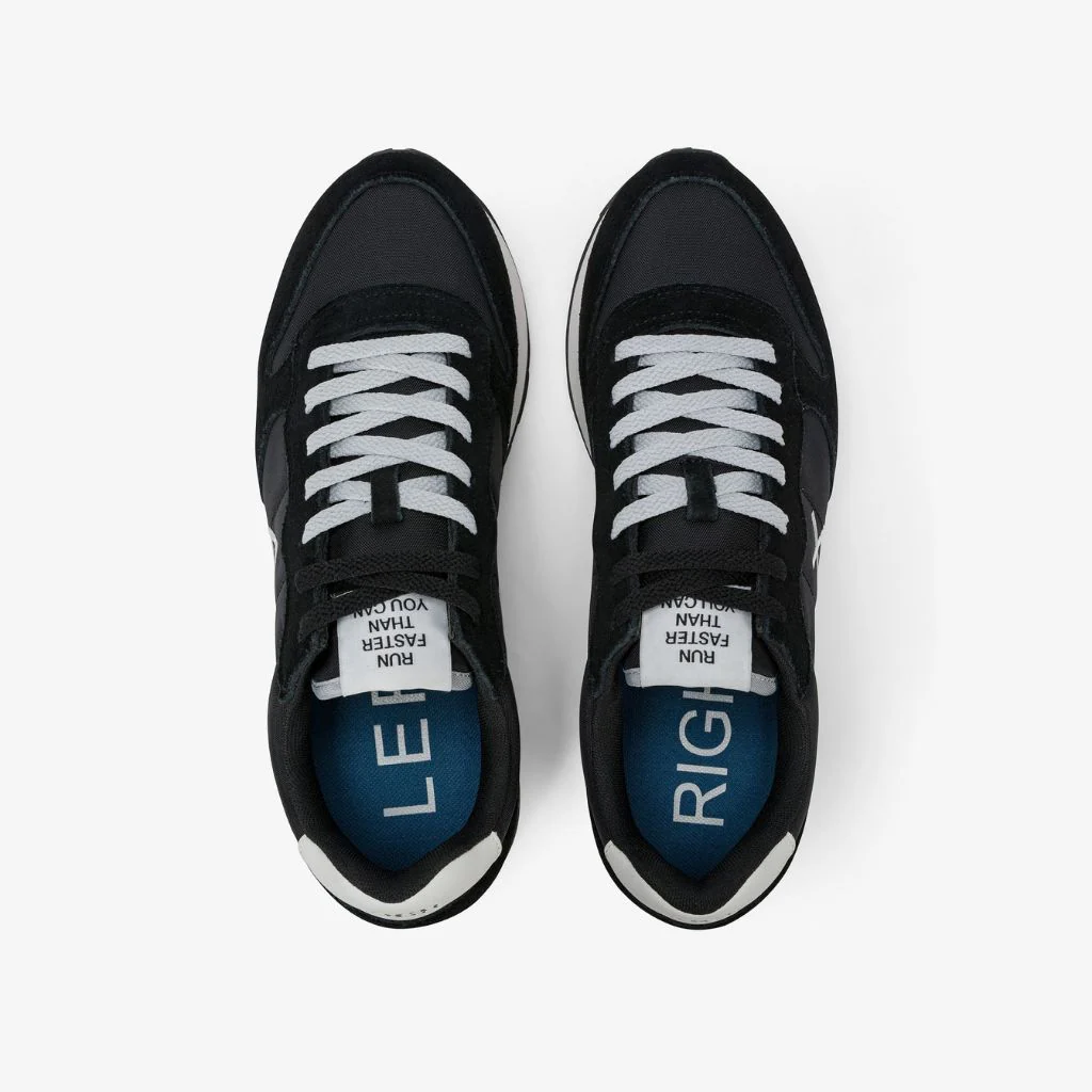 La tomaia è in tessuto nero impreziosita da riporti in pelle scamosciata che aggiungono texture e profondità al design. La suola bassa garantisce leggerezza e comfort durante tutta la giornata, mentre l’imbottitura interna assicura una calzata morbida e avvolgente. Dettaglio distintivo: la scelta tra laccio bianco e laccio nero, per personalizzare il look in base al proprio stile. Logo laterale Sun68 come firma discreta del brand.