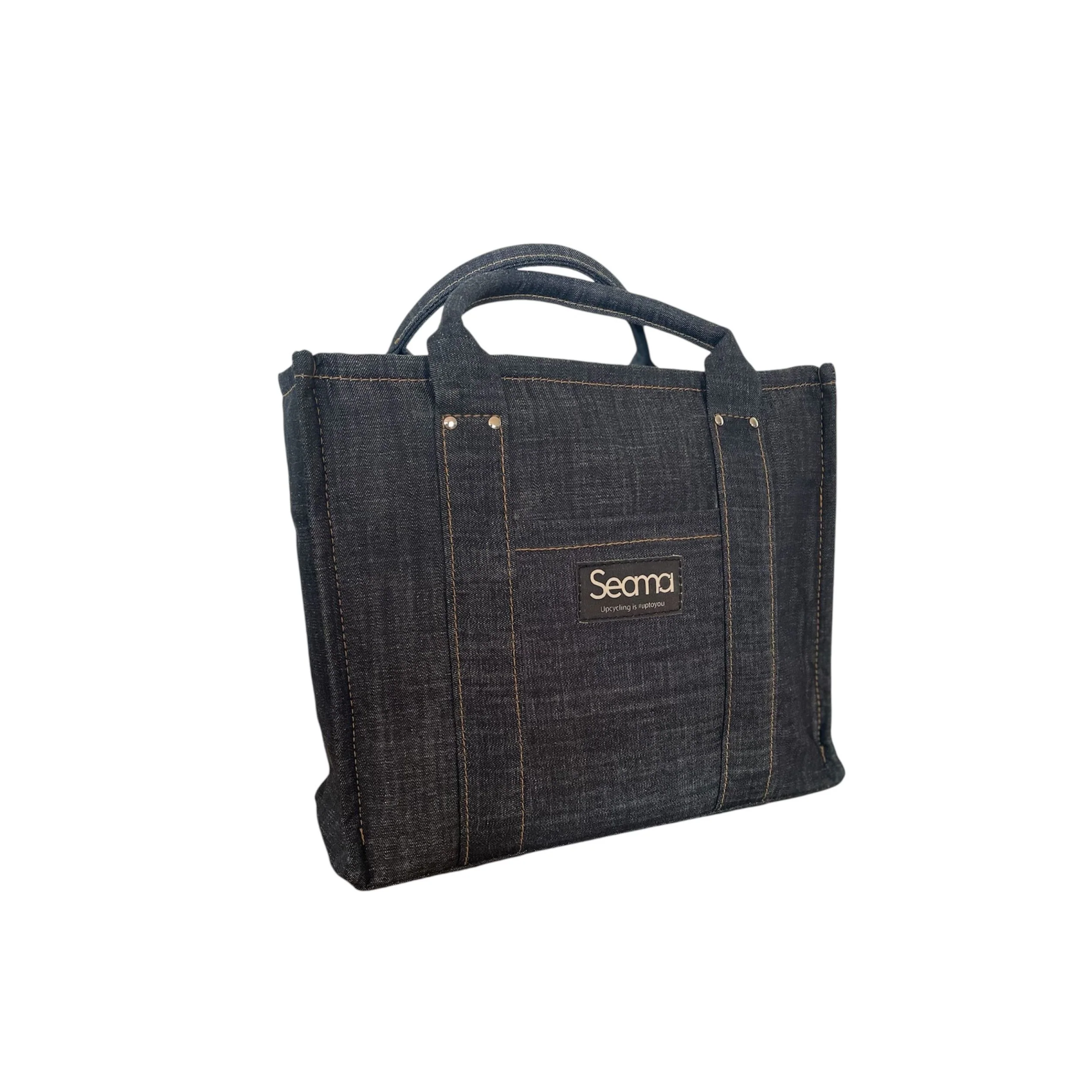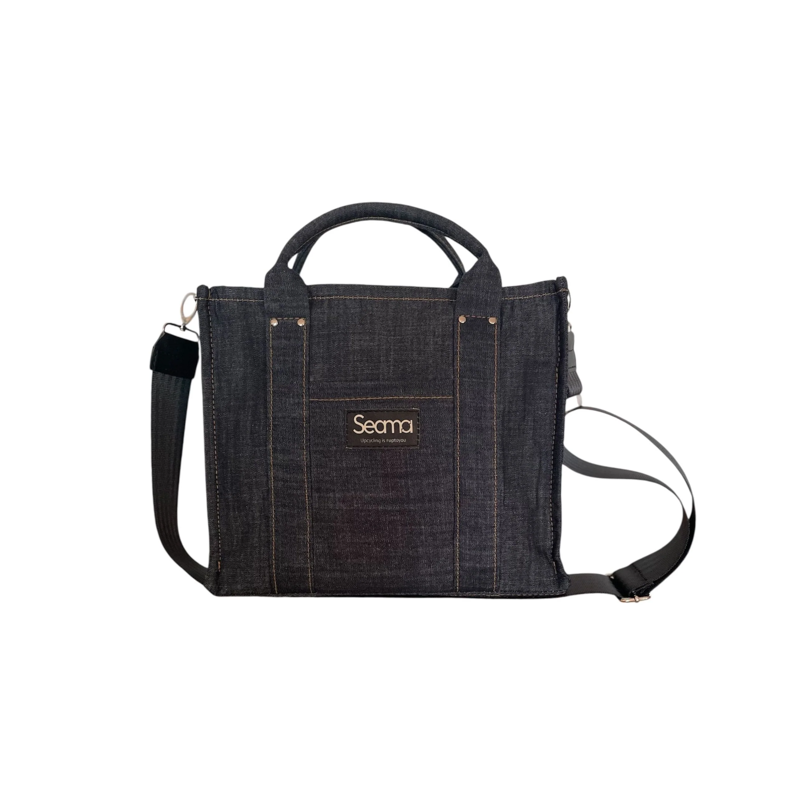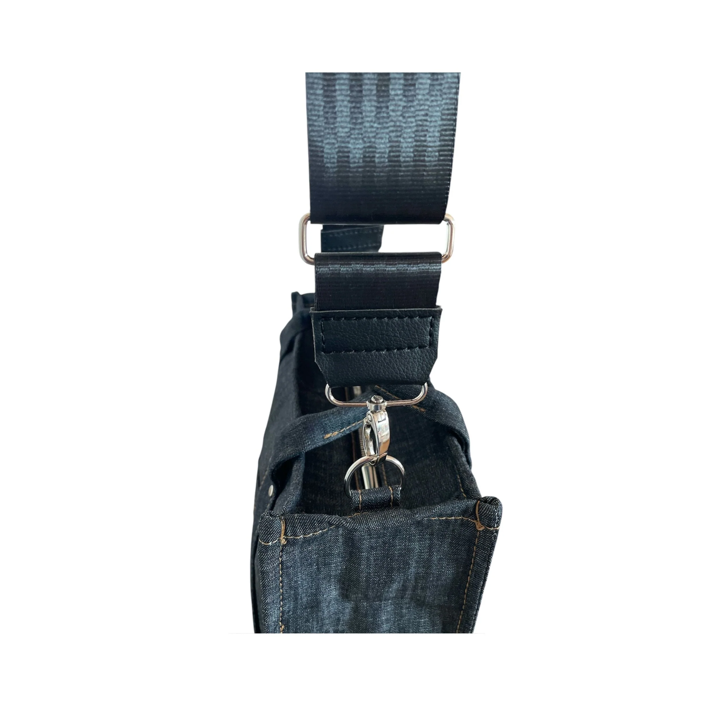 Versatile e di tendenza, la Tote San Francisco in formato medio è realizzata in denim riciclato, ottenuto da scarti di tessuto jeans. Può essere portata a mano oppure a spalla grazie alla tracolla nera regolabile, realizzata dal recupero di una cintura di sicurezza automobilistica. Dotata di chiusura a zip, presenta una pratica tasca esterna per il cellulare, una tasca interna per piccoli oggetti e un porta bottiglia interno con elastico nero per tenere tutto in ordine.