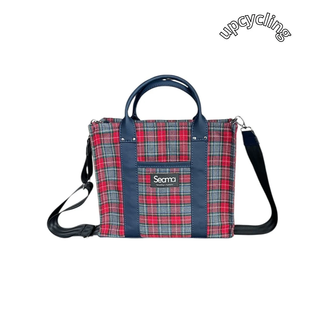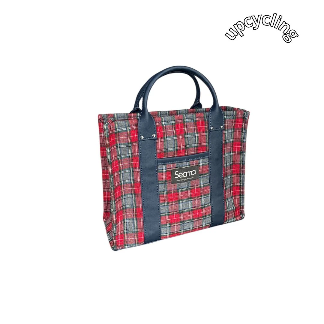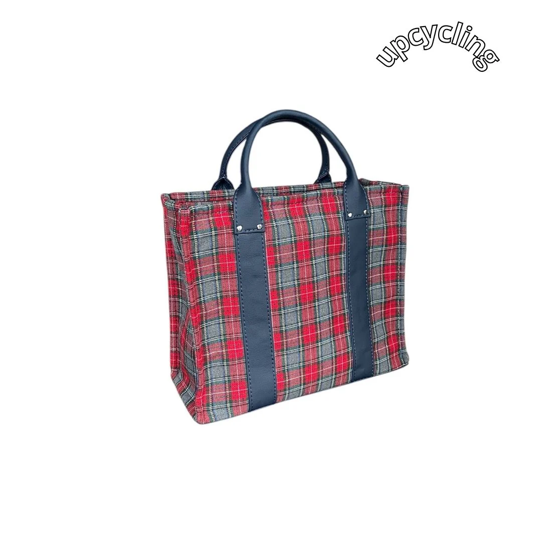 La Tote Tweed scozzese è una borsa elegante e sostenibile, realizzata in un tessuto a motivo tartan nelle tonalità del rosso, verde e bianco. È arricchita da dettagli in materiale alternativo alla pelle di colore blu, che ne valorizzano la raffinatezza.