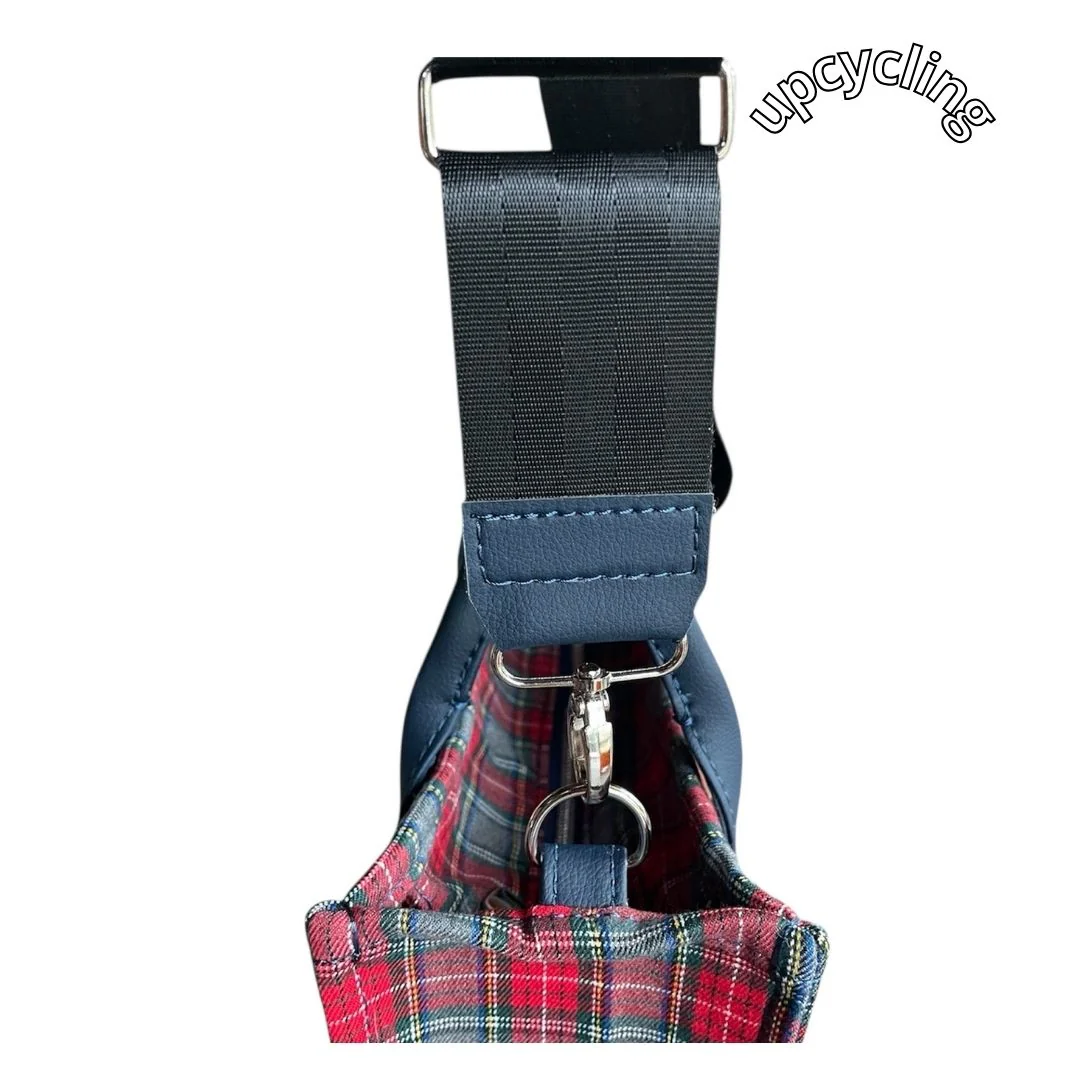 La tracolla è ottenuta dal recupero di una cintura di sicurezza delle auto.