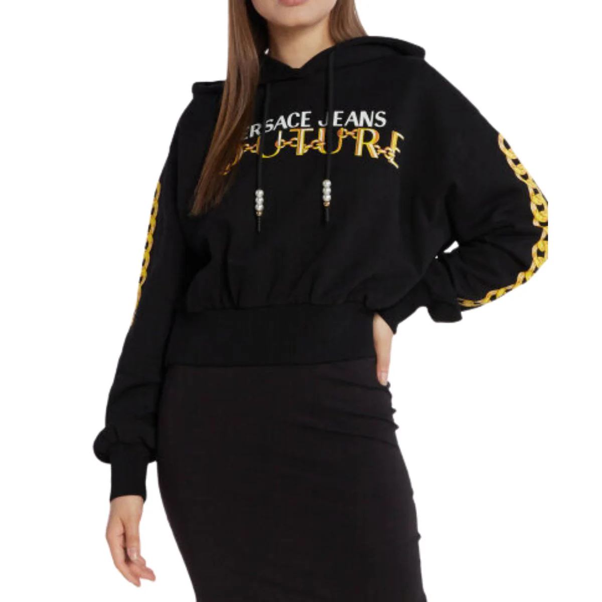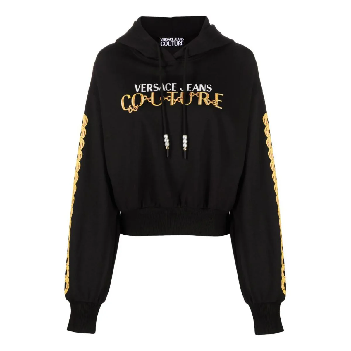 Felpa Versace Jeans Couture in cotone con Chain logoCodice Articolo: 75HAIF01 CF01FComposizione: GENERAL COTTON 100 % • Stile casual• Modello ritagliato• Vestibilità morbida• Cotone• Collo con cappuccio e coulisse• Spalle cadute• Maniche lunghe• Polsini a costine elasticizzati• Stampa Catena stampata a contrasto• Logo catena Versace stampato a contrasto• Orlo dritto a coste