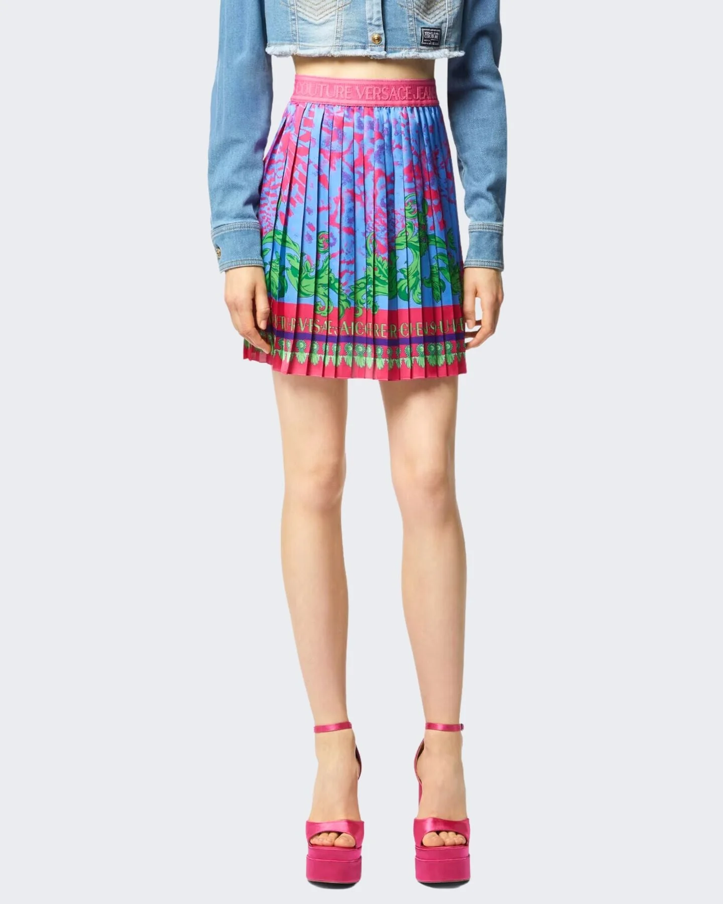 Versace Jeans CoutureMinigonna plissettata con stampa Animalier all-over e vita elasticizzata con logo Institutional in jacquard.Stampa AnimalierMotivo con logo InstitutionalVita elasticizzataComposizione esterno: 100% poliestereArticolo: 76HAE8P1NS434261