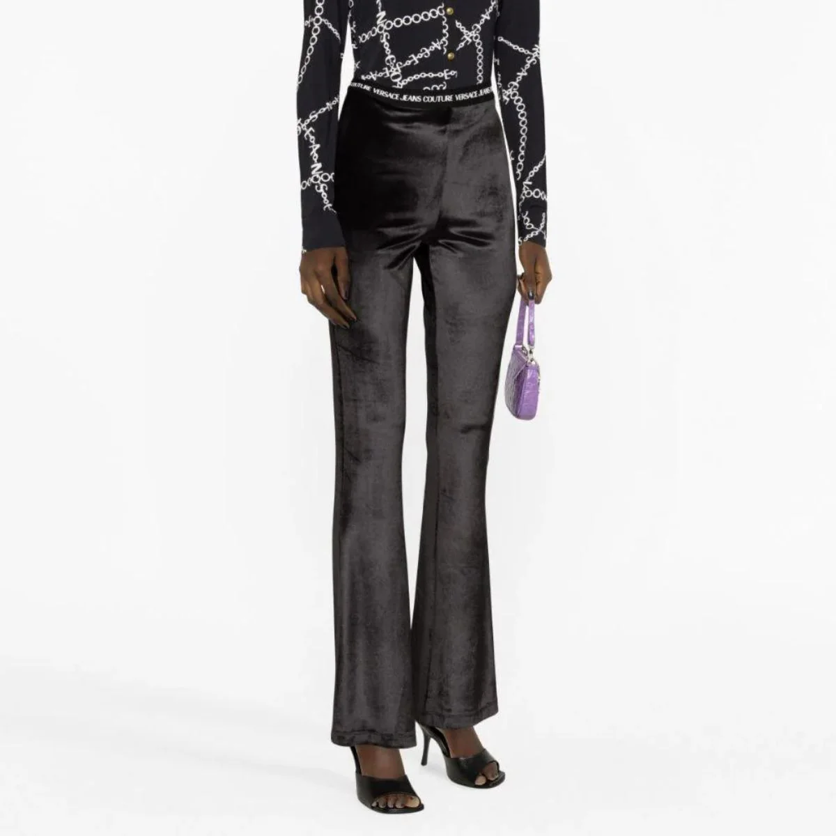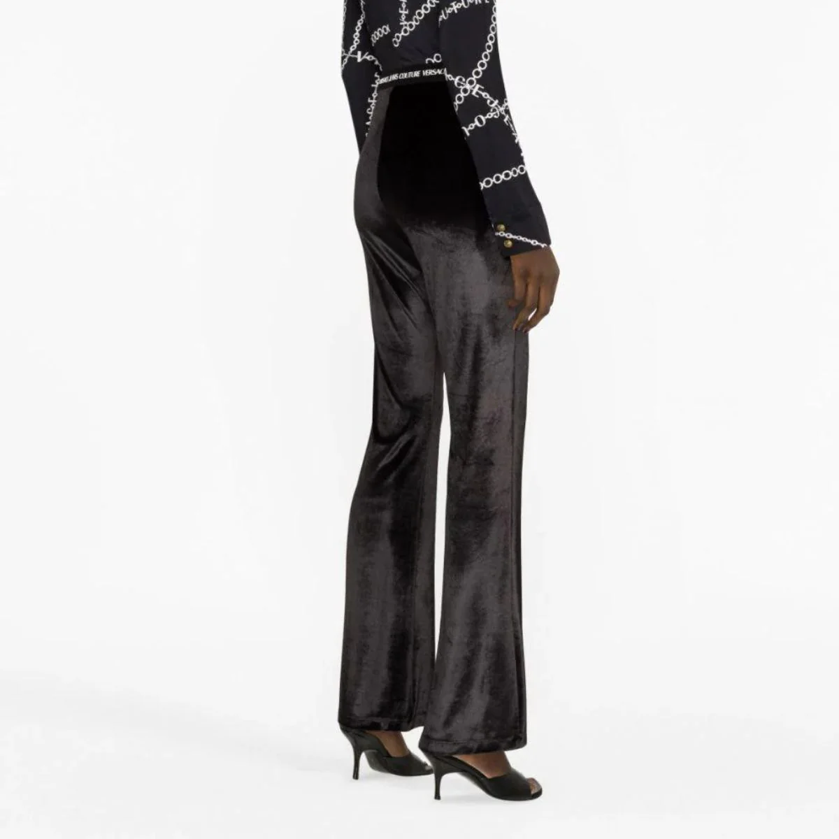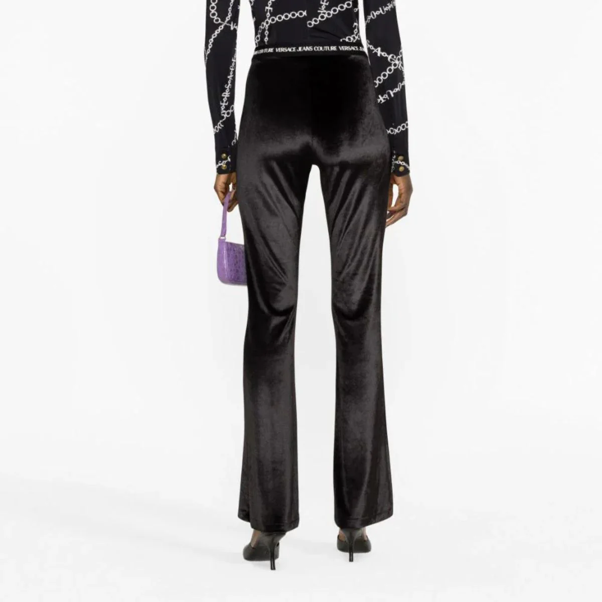 Versace Jeans CouturePantalone a zampa in velluto neroCodice Articolo: 75HAC1A7 N0225 DescrizioneGamba flaredVita altaScritta logoElastico in vitaLavaggio a mano95% PES, 5% EL