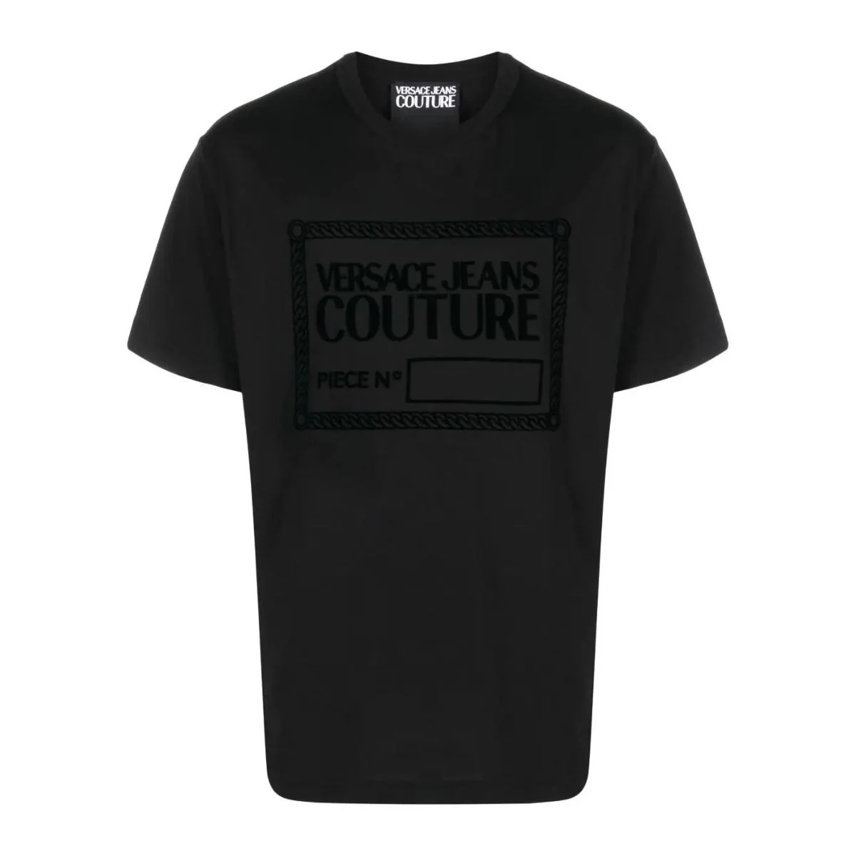 VERSACE JEANS COUTURET-shirt con logo Nero, cotone, design monocromo, logo floccato, maniche con spalle scese, girocollo, maniche corte e orlo dritto. Codice Articolo: 75GAHT11 CJ00T