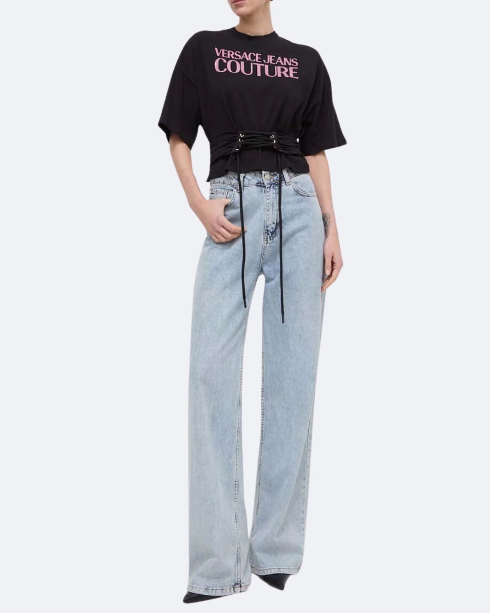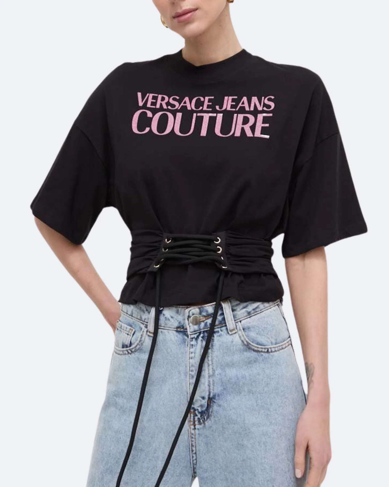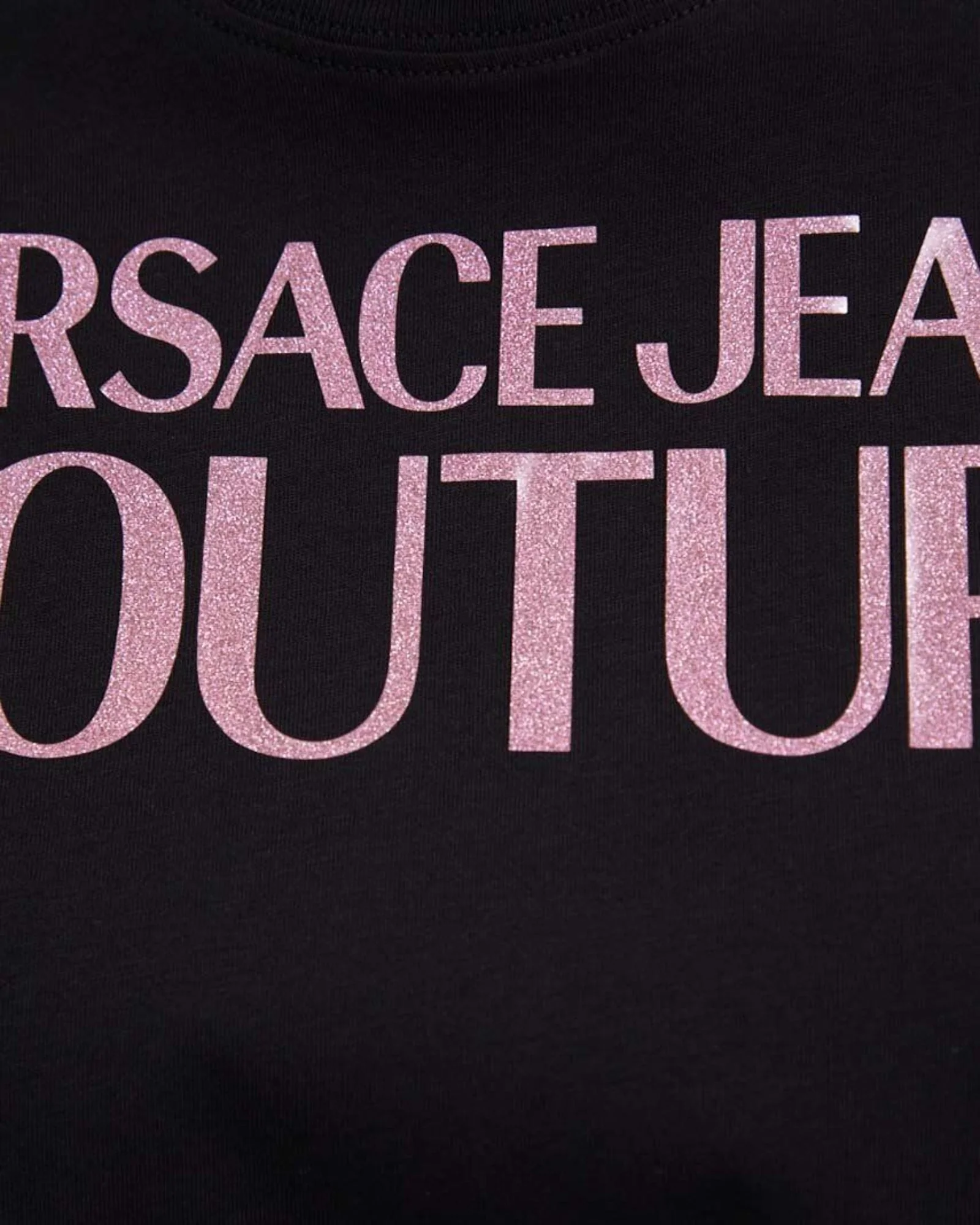 Versace Jeans CoutureLa T-shirt in cotone a maniche corte presenta un logo Institutional con glitter, spalle rilassate e dettaglio con lacci.Motivo con logo InstitutionalManiche corteGirocolloDettaglio con lacciComposizione esterno: 100% cotoneArticolo: 76HAHG04/CJ00G