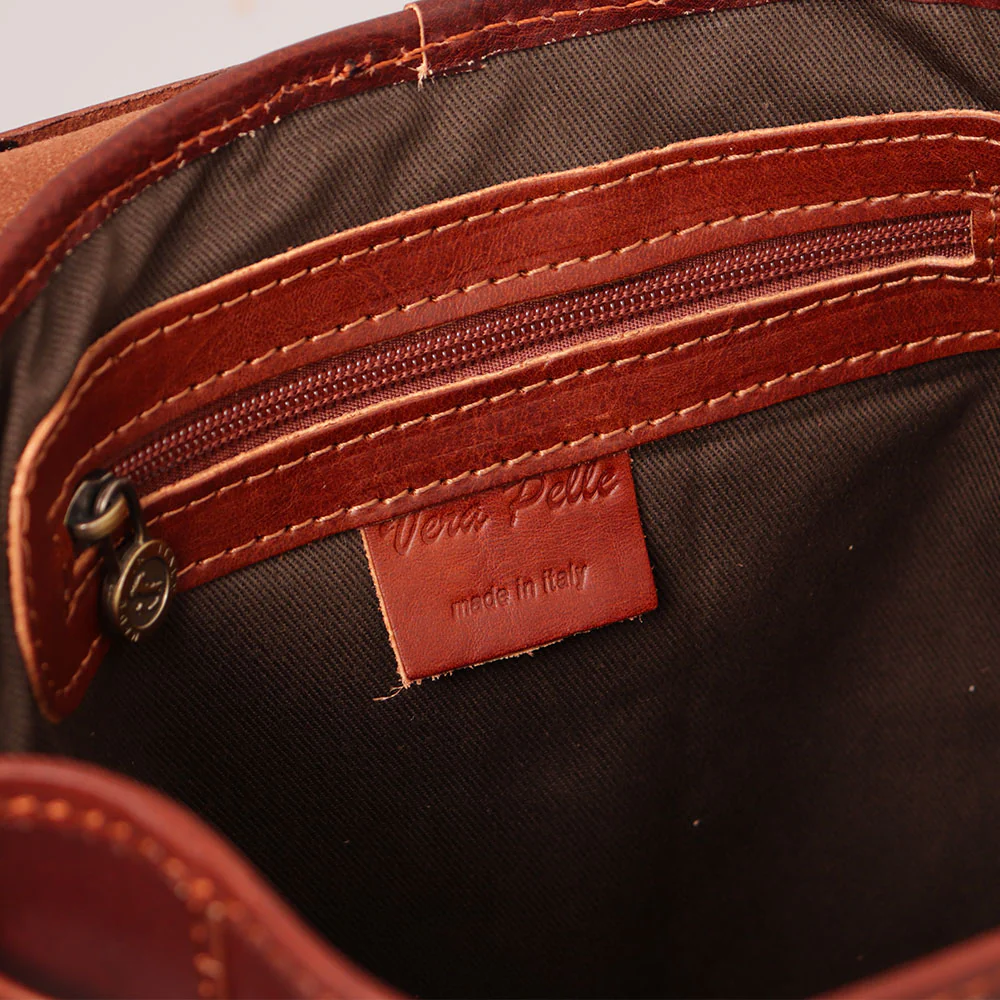 Lo zaino ViaVerdi è realizzato con pellami certificati dalle migliori concerie toscane. La qualità della pelle pieno fiore conciata al vegetale tamponata a mano è frutto di una selezione accurata dei nostri esperti artigiani fiorentini. Il materiale scelto arriva direttamente nelle sapienti mani di pellettieri qualificati, le quali rendono il prodotto unico nel suo genere perché destinato a durare nel tempo.
