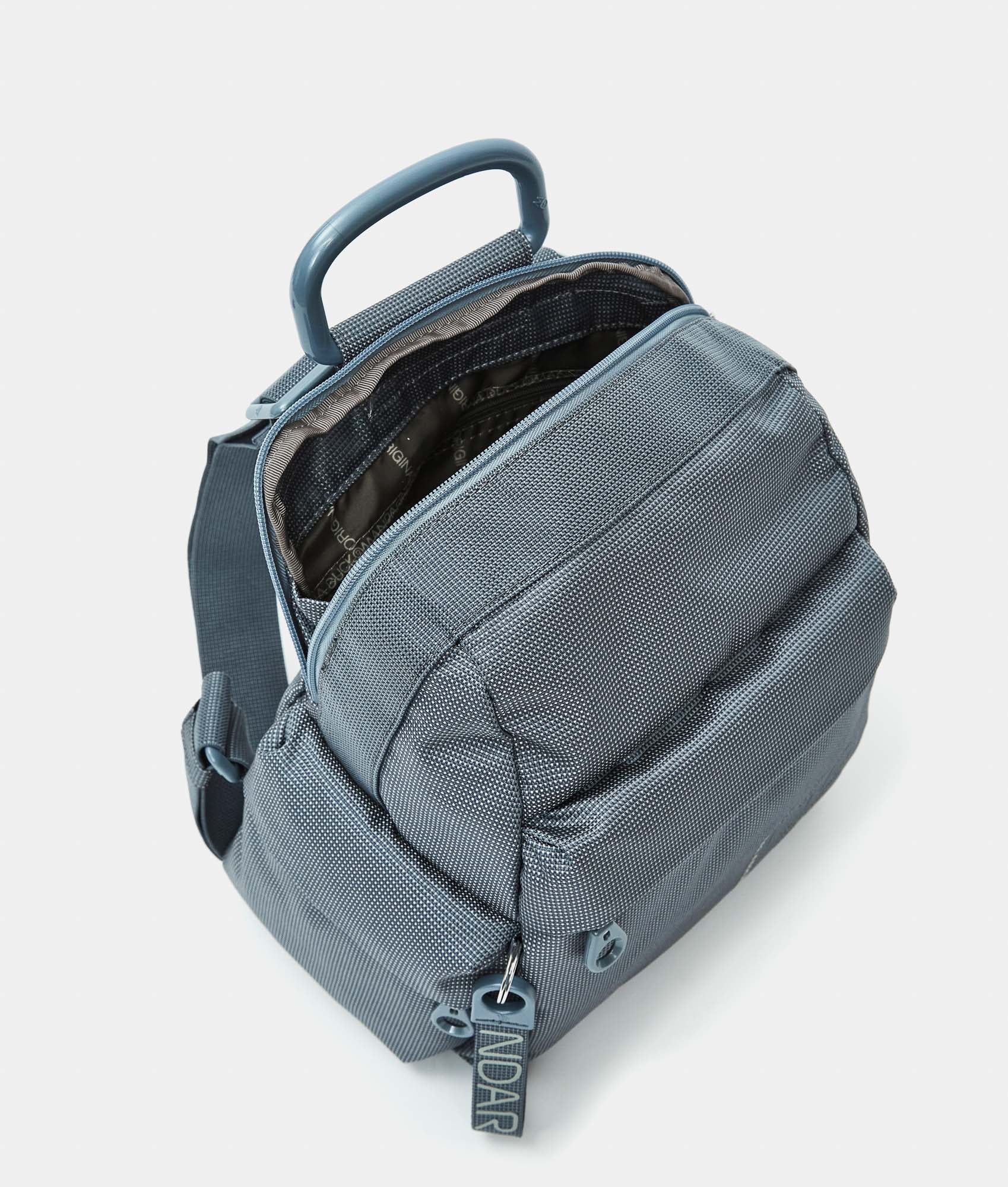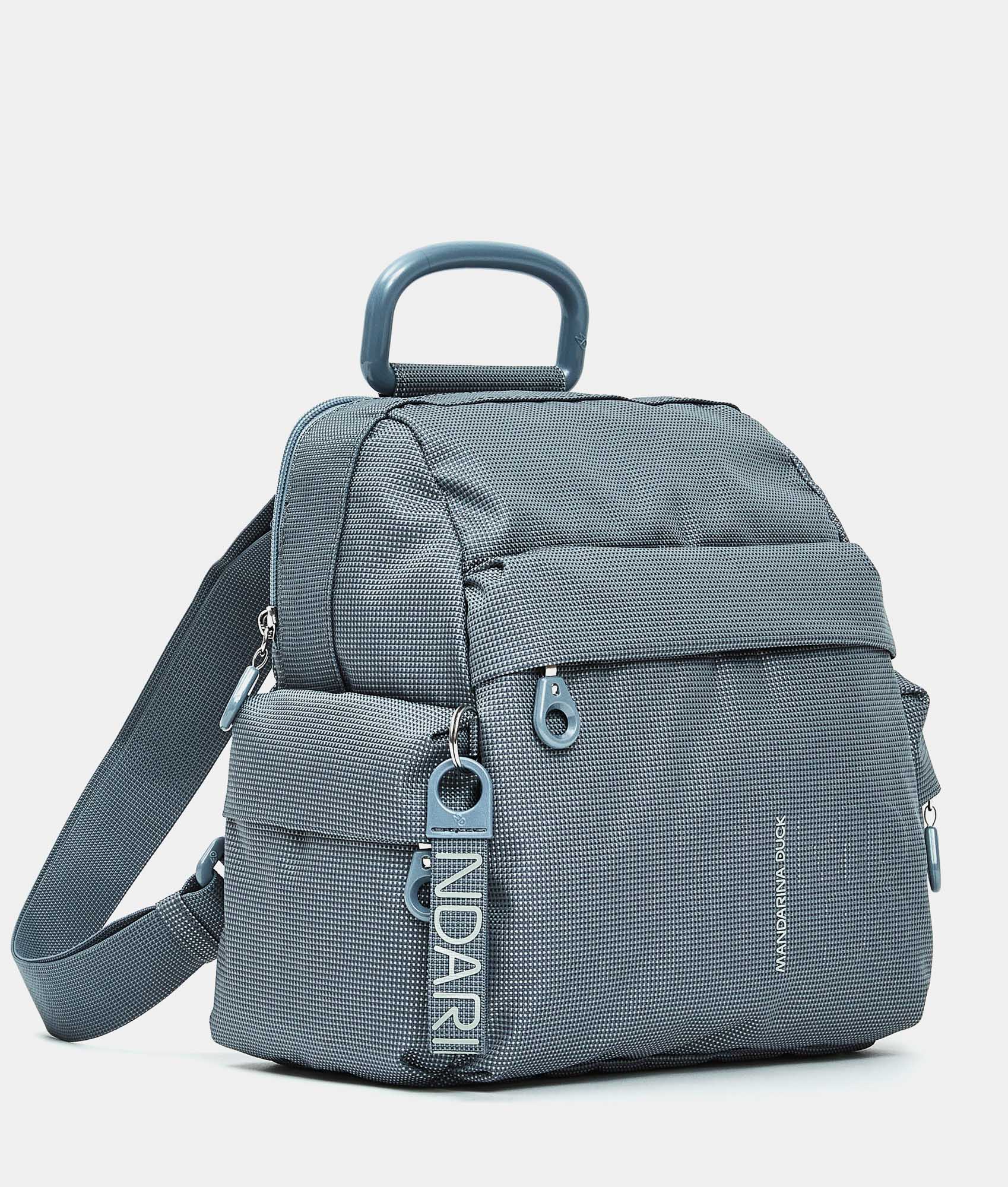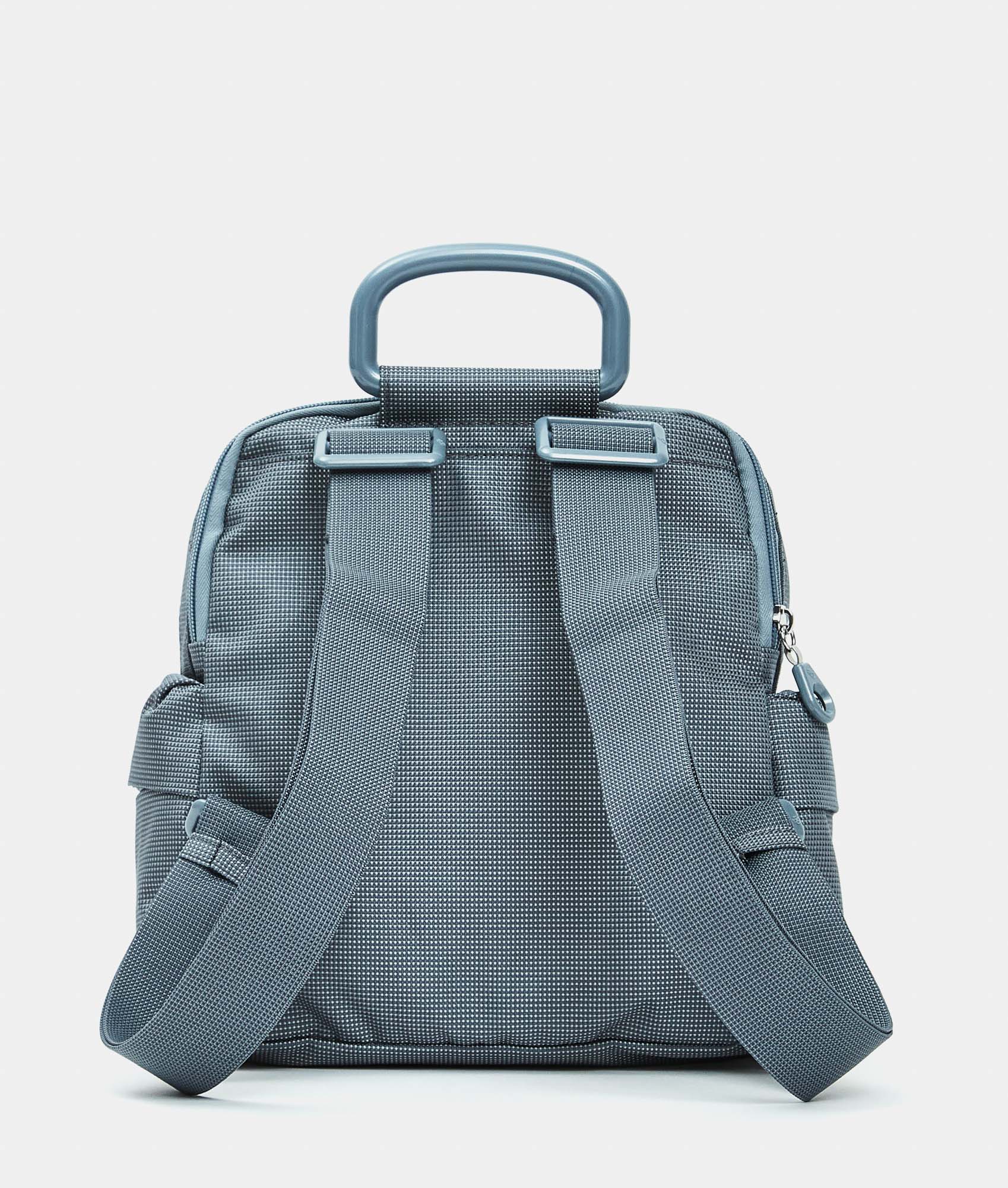 Piccolo zaino con manico, grande tasca frontale e tasche laterali con zip in tessuto. Dettagli personalizzati e cinturini jacquard regolabili.