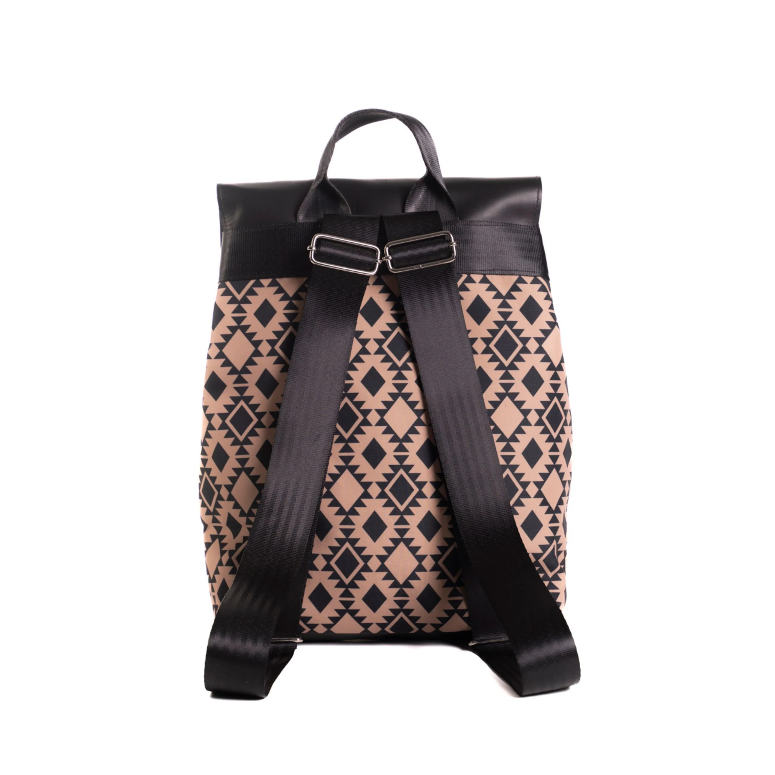 Colore: tessuto beige scuro a losanghe nere, con patta, fondo e profili in pelle nera